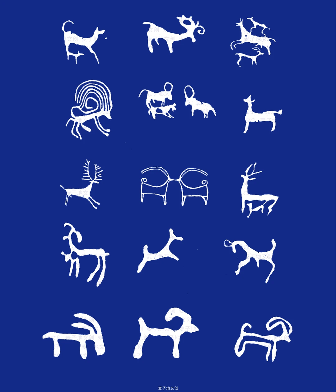 岩画鹿纹样以简练线条和动态感为特点,如阴山岩画的单鹿突出鹿角。现代设计中可借鉴其: