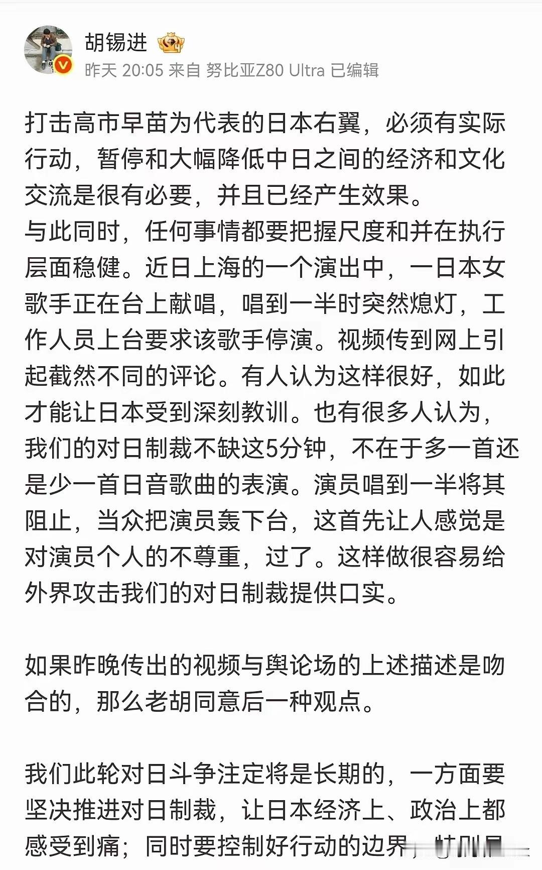 胡锡进,你给我住口! 网上有个段子,说,“如果日本人和外星人打起来了,你支持谁?”很多人的回答是,“我支持外星人,毕竟就都是人,而日本人不是人。” 11月29日,日本歌手大槻真希上海演唱时被忽然叫停,中途遭遇,演出团队与观众措手不及。主办方称技术故障导致不可抗力中断,但日本媒体和部分政界人士将事件解读为政治因素或当局干预。演出方正就赔偿与解释与场馆方面沟通,事件在日方舆论被放大,成为批评中国市场环境和制度透明度的素材。他们自己是很敏感的,这就说明日本人在各个方面都怕中国人的反击。 日本人的观点很极端吧,不仅日本人这样,中国人也有这样的,胡锡进就是如此。他说,“暂停和大幅降低中日之间的经济和文化交流是很有必要,并且已经产生效果。”出了效果怎么了,我们就不能继续追穷寇了吗?老胡继续说,“任何事情都要把握尺度和执行层面的稳健。我们的对日制裁不缺这5分钟,不在于多一首还是少一首日音歌曲的表演。这首先让人感觉是对演员个人的不尊重,过了。这样做很容易给外界攻击我们的对日制裁提供口实。”日本人又何尝给过我们丝毫的原谅与解释,为什么遇到事情就要替日本人着想呢,这种以德报怨的思想是不是和蒋介石当年的思想一样呢,我为什么对日本人就不能赶尽杀绝的那种打法呢。 胡锡进,你给我住口!我感觉到老胡应该闭嘴了。胡锡进在很多问题上总是有另类,只是在几乎所有的问题上,都有一种砌墙派的感觉。一样的话题,从他嘴里一说出来,怎么有一种哎不太舒服不干脆,不利落的感受,或者是两边都想讨好,又想表达又想掩盖,一拉一扯不知道不知所措的那种感觉。 我们提倡在中日关系大是大非的问题上,就要与国家的立场站的一致,站在国家的这一边。立场!立场决定一切,就是说我们有时候做的不符合什么套路但有效果的时候,我们也不能批评自己这个阵营,也不能阴阳自己这个队伍,因为我们不是对面的人,不需要替他们着想。