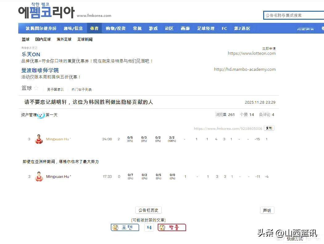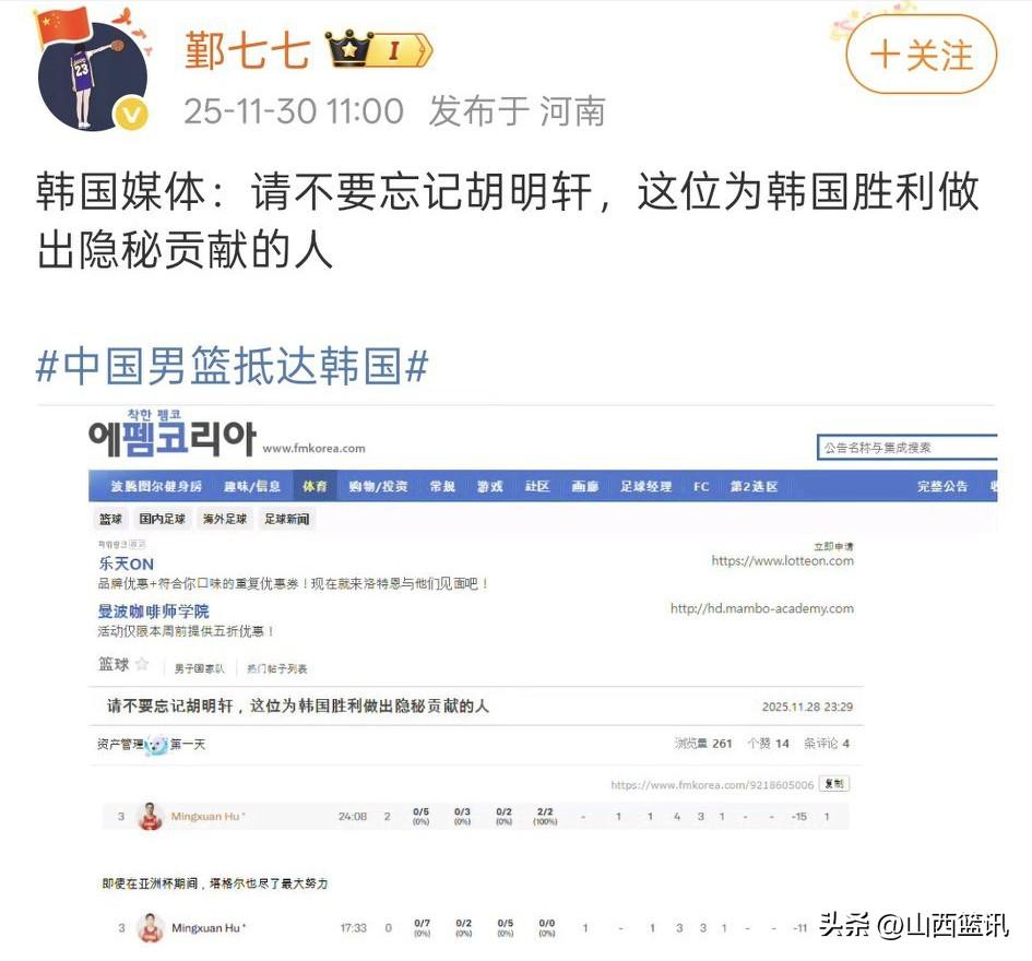 韩国媒体视胡明轩“为韩国胜利做出隐秘贡献的人”!韩国男篮在北京五棵松战胜中国男篮后,韩国媒体有点肆无忌惮涧,故意用中文把胡明轩标榜成“为韩国胜利做出隐秘贡献的人”,且特别强调“请不要忘记胡明轩。”这明显是让中国球迷看的,即使不懂韩文也能看懂其意。胡明轩被韩国媒体大捧特捧的原因在哪里?胡明轩代表中国男篮出场24分钟,5中0,正负值-15。胡明轩能不能看到这个带走讽刺意味的消息?假如能看到,胡明轩绝不会甘心沉沦,也绝不接受如此的羞辱。有球迷指出,胡明轩不可能第二场还会蛰伏,一定会在压力下奋起,明天中国男篮战胜韩国男篮功勋之一便有胡明轩!