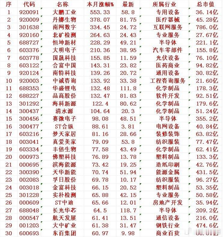 1月A股涨幅榜TOP30(部分核心标的)重磅出炉!这些牛股领涨全场:- 大鹏工业:月度暴涨553.33%,最新股价报58.80元,涨幅冠绝全场;- 丹娜生物:狂涨378.07%,股价升至81.75元,表现极具爆发力;- 南网数字:累计上涨334.45%,最新价24.72元,跻身涨幅前三;- 北矿检测:大涨264.63%,股价收于24.43元,成为赛道黑马;- 恒坤新材:涨幅达228.29%,最新报价49.21元,走势强势;- 大明电子:上涨210.36%,股价推升至38.95元,领涨细分领域;- 国晟科技:累计涨幅155.85%,最新价11.59元,表现亮眼;- 合富中国:大涨143.31%,股价收于23.82元,跻身月度牛股行列。