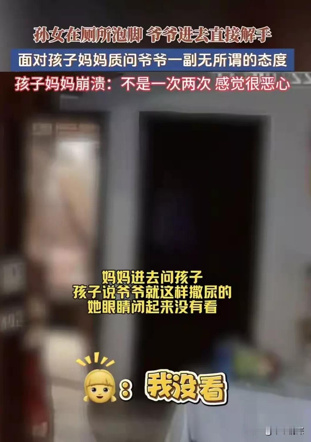 在2025年11月27日,从这张图片中可以了解到,一个爷爷进厕所,在厕所里面捡手,孙女也在厕所里面,听说在泡脚,男女有别,这是古人留下的一句话,何况是爷爷,有很多的老人都是在不经意的时候,做出了这样的举动,也许都感到的无奈,但有孙女在旁,应该都发现有人,而且先把孙女叫出去,这种情况有的时候也是避免不了的,一家人在家里面厕所也是一个重要的环境,如果每个家庭都是有两个厕所,写个男女,那可能要好一些。