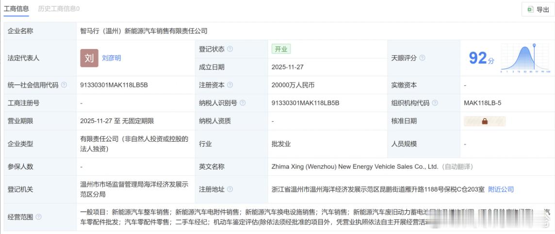 由威马持股的新能源汽车销售公司成立天眼查信息显示,11月27日,智马行(温州)新能源汽车销售有限责任公司成立,该公司位于浙江省温州市,法定代表人为刘彦明,注册资本为2亿人民币,是一家以从事批发业为主的企业,经营范围包括新能源汽车整车销售、新能源汽车电附件销售、新能源汽车换电设施销售、汽车销售等。依据股东信息显示,其由威马汽车制造温州有限公司全资持股。后者于2016年5月成立,是威马汽车科技集团的全资子公司,法定代表人为威马创始人SHEN HUI(沈晖),注册资本为40.40亿人民币,实缴资本为9040.404万人民币,是一家以从事汽车制造业为主的企业。