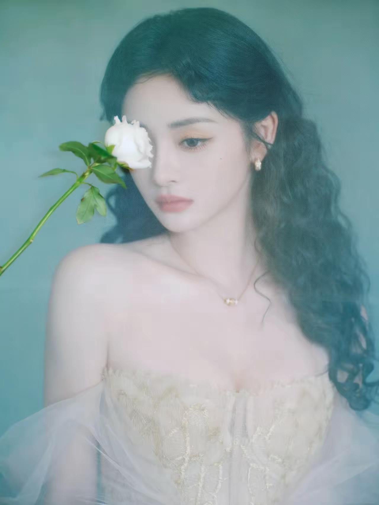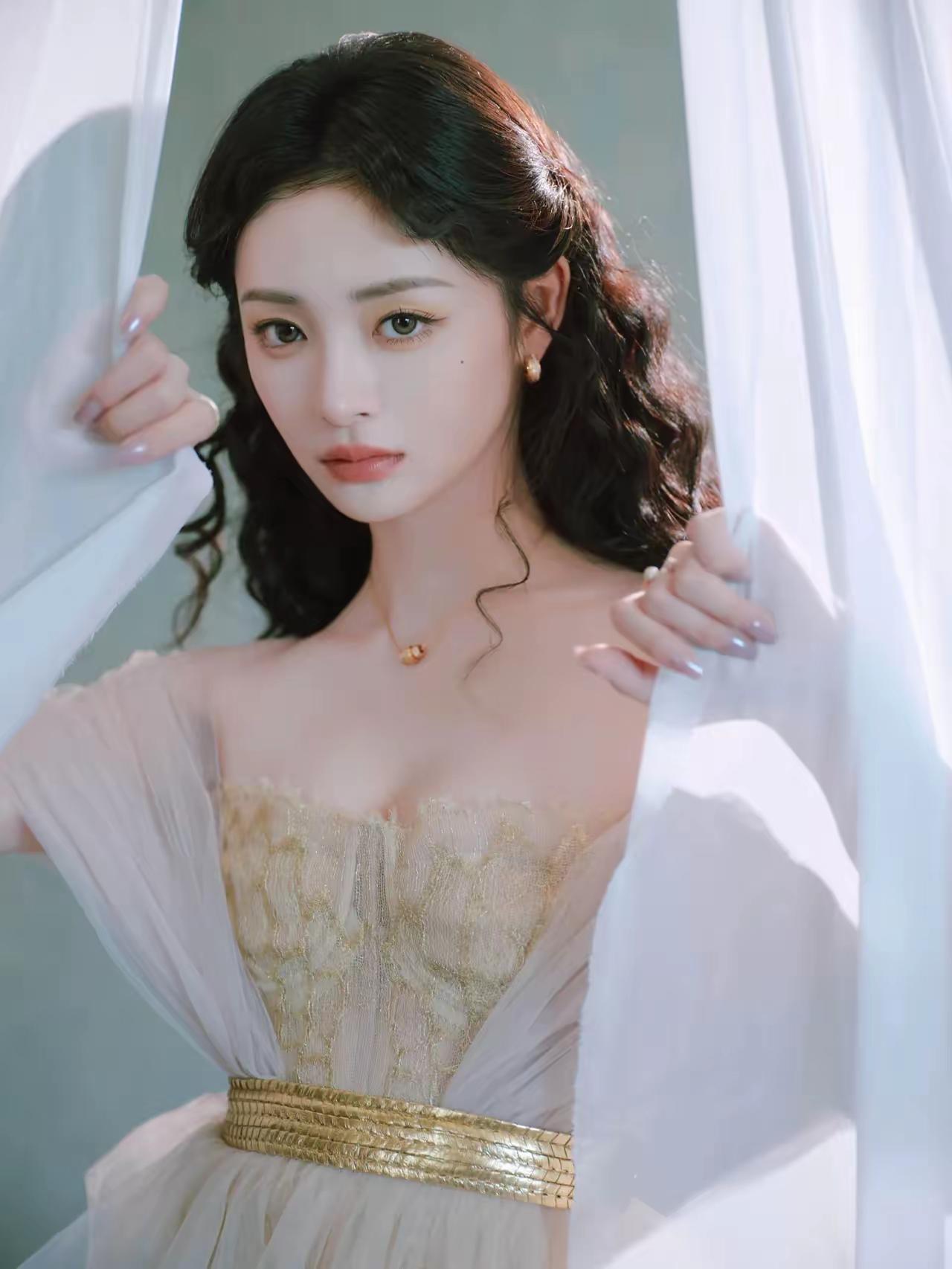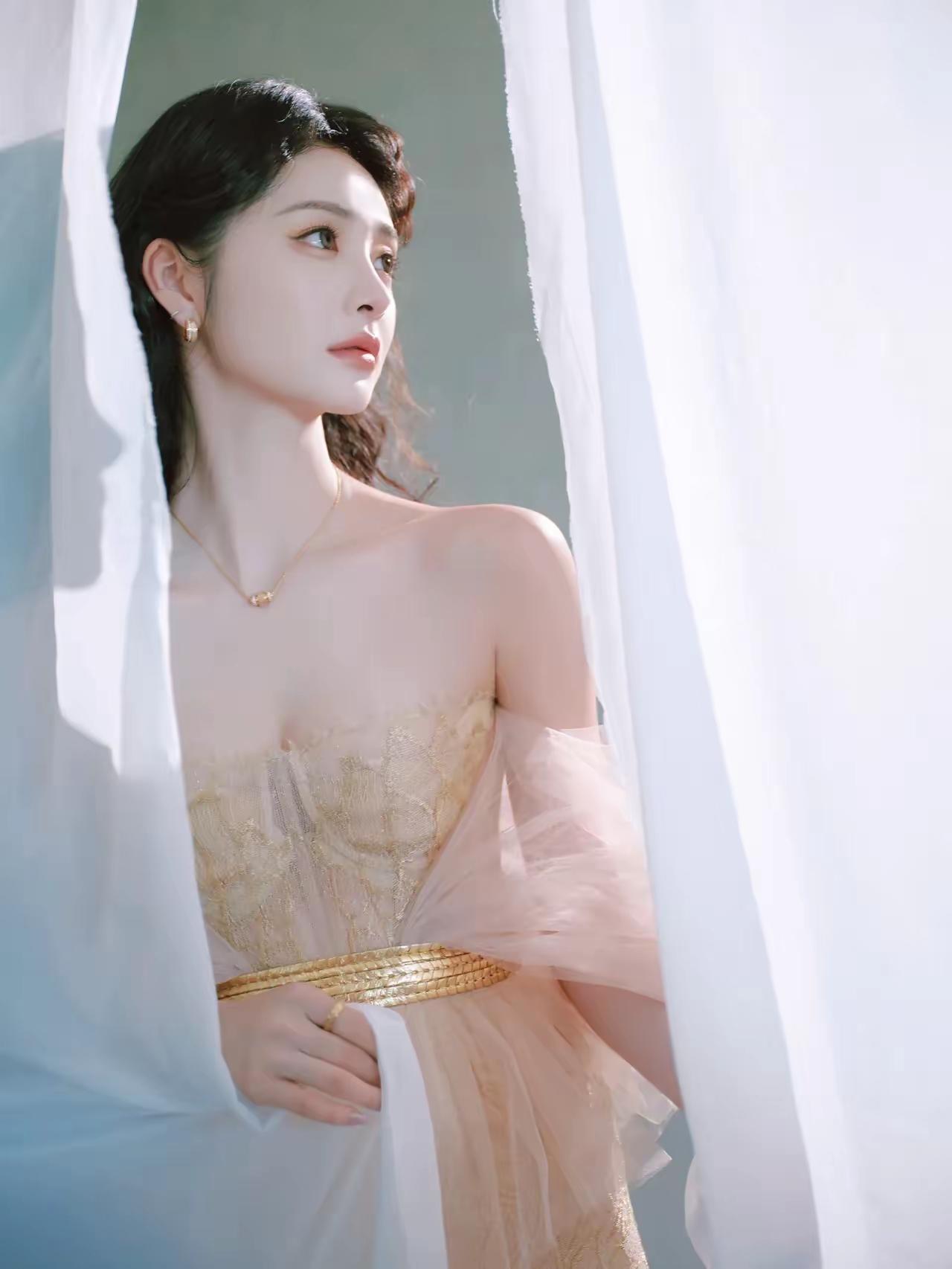 海浪漫过堤岸的黄昏,孟子义裹着一身“贝壳裙”站在风里——抹胸上粉白渐变的贝壳纹路
