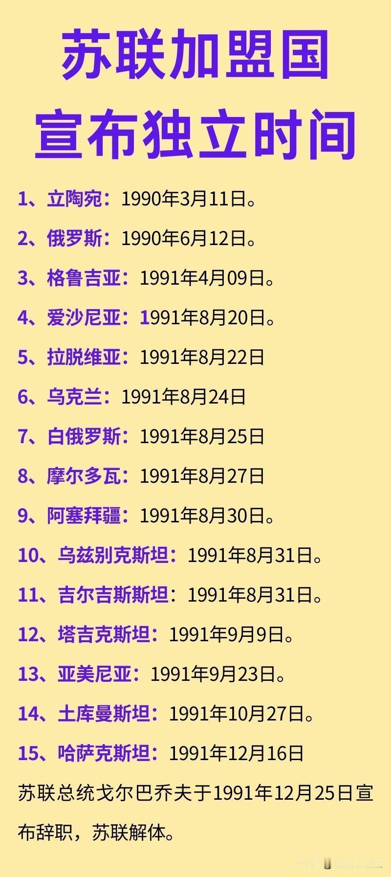 苏联解体时,各加盟国是什么时间独立的? 苏联其实是一个联邦制的国家,他是由15个国家加盟组成的,这些国家有的在亚洲,有的在欧洲,因此苏联成为了罕见的横跨亚欧两洲的国家; 苏联解体,其强大的军事力量,比如大量的飞机、坦克、火炮、军舰等,主要由俄罗斯和乌克兰两国继承,而苏联至关重要的核武器, 则由俄罗斯、白俄罗斯、乌克兰、哈萨克斯坦继承,但现今仅有俄罗斯还保留着没有销毁; 至于其他国家为何要销毁这“国之重器”呢?原因是多方面的,内部原因是他们经济负担过重,养不起这东西,外部原因是西方各国出于自身利益考虑,强烈要求其销毁。