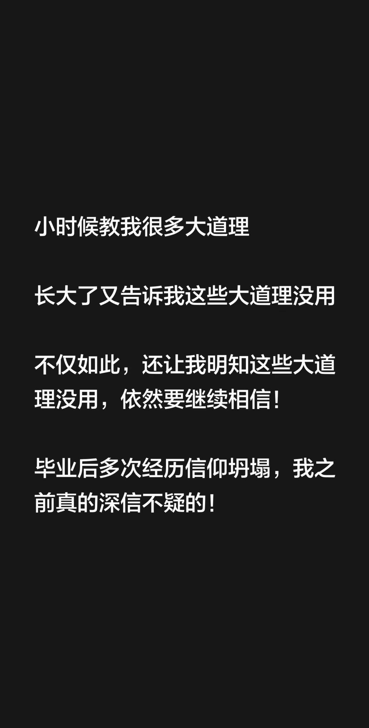小时候教我很多大道理长大了又告诉我这些大道理没用不仅如此,还让我明知这些大道理没用,依然要继续相信!毕业后多次经历信仰坍塌,我之前真的深信不疑的!