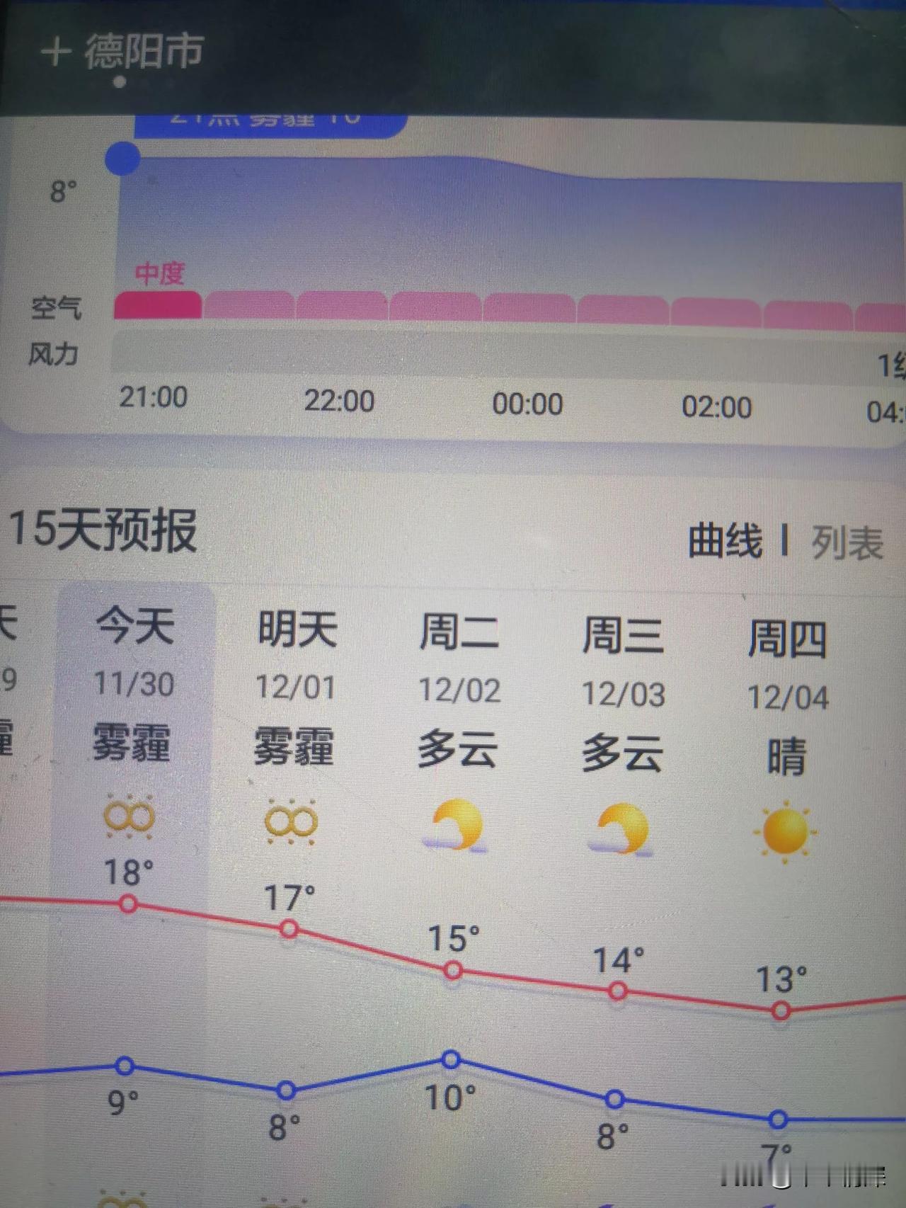 德阳市天气预报,今天是2025年11月30日,德阳市北部旌阳区,什邡市,绵竹市,罗江,今天晚上到明天白天,气温在9到17度,其中明天上午有雾霾天气出现。 德阳市中江县南部当地,今天白天也是雾沉沉的,轻易天气一样,今天晚上到明天白天是阴间多云天气,其中早晨有轻雾天气出现,气温6到16度天气,当地周边地区,资阳市和成都市,遂宁市气温降到6度17度天气,早晨局部有轻雾天气体现。 德阳市天气预报,德阳市今天晚上到,明天白天是晴转多云天气,气温在七到17度之间,其中明天白天局部地方有雾霾天气出现,过往当地的车辆要注意安全,谨慎驾驶。