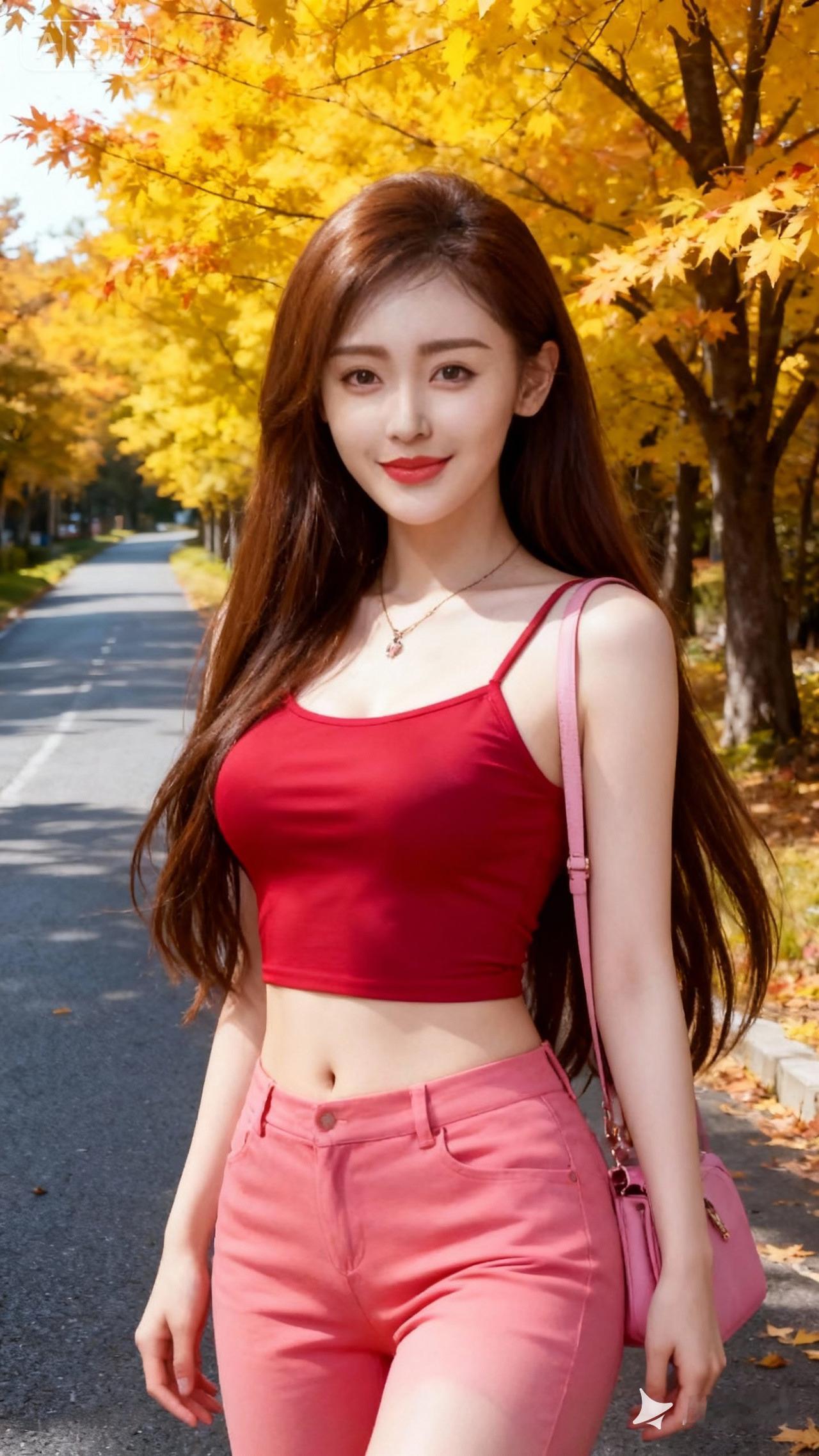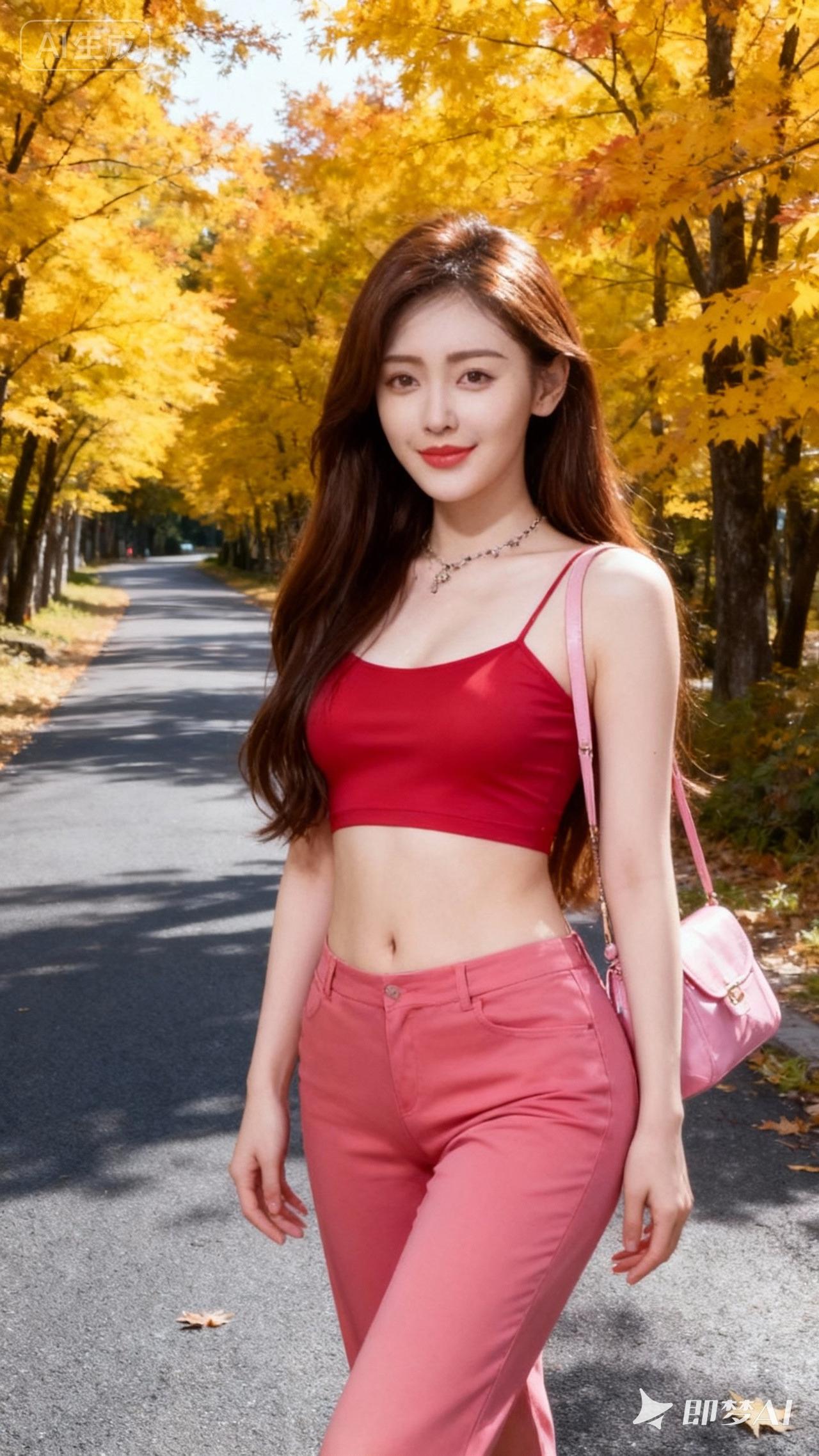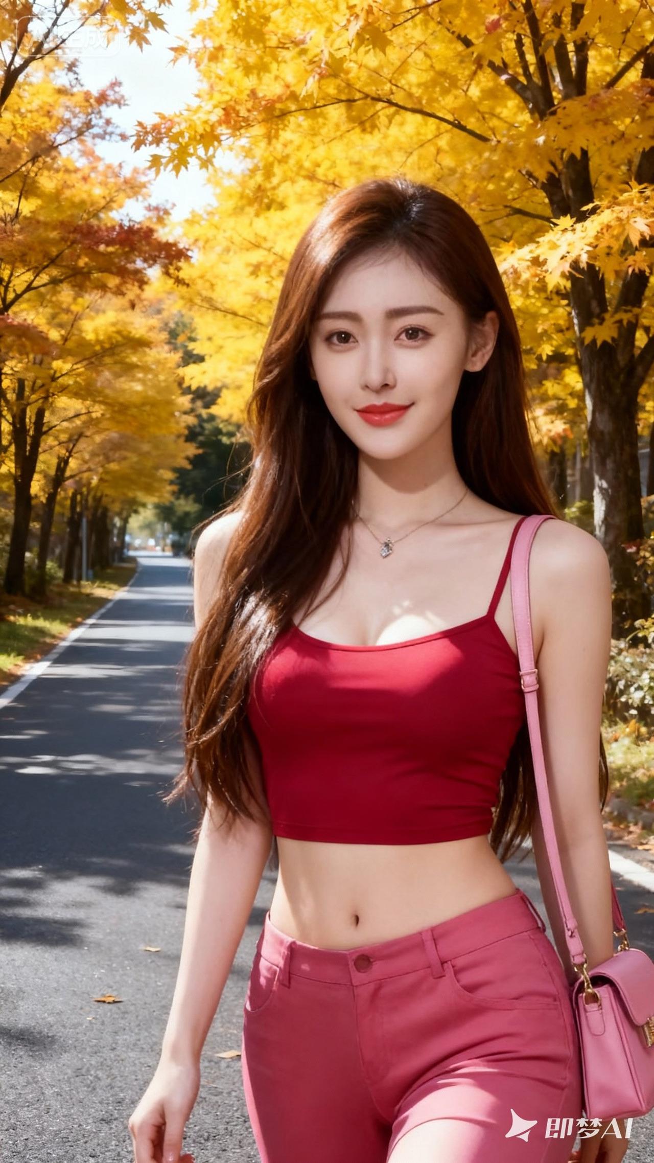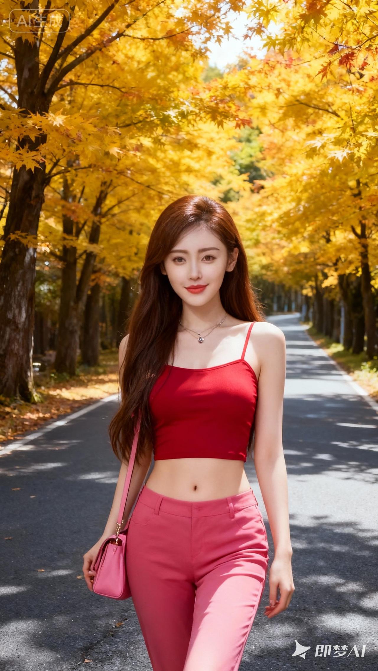 秋日漫步,红衣少女与金黄落叶相映成趣