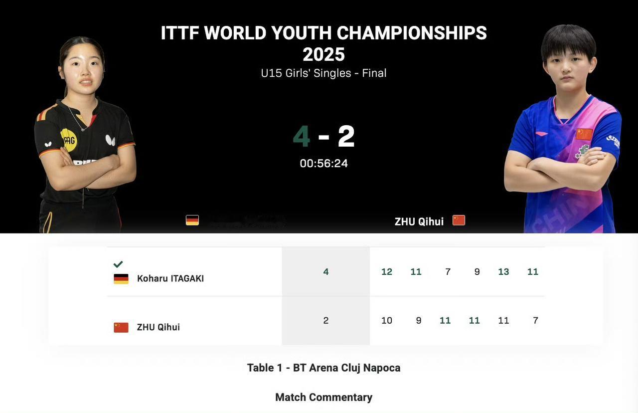 世青赛丨祝启慧2-4不敌坂垣心春获亚军! 国际乒联世青赛U15 女单决赛,国乒小将祝启慧以大比分2比4不敌德国籍日裔小将坂垣心春屈居亚军! 坂垣心春在半决赛战胜了日本选手村松心菜,表现出强大的战力,决赛中前两局关键分未能拿下来,失了先机,在第三、四局顽强扳平大比分,又在第五局决胜时刻未能抓住机会,相当可惜!祝启慧在双打中获得了冠军,本次比赛还是有收获的!