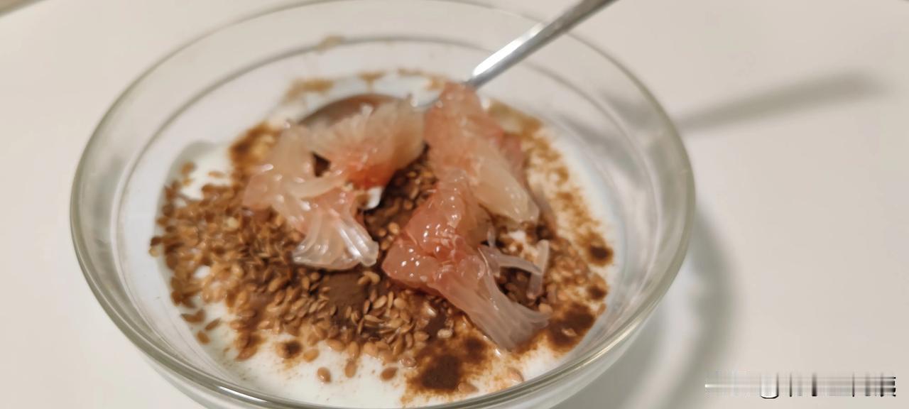 中午吃完饭我就从冰箱里取出一大罐子新疆酸奶,到半碗泡上燕麦片。放上几个小时,燕麦片泡透了,也没那么凉了。吃的时候再撒上点炒熟的亚麻籽和可可粉。 对了,还放了几块柚子肉。让它营养口感更加分。