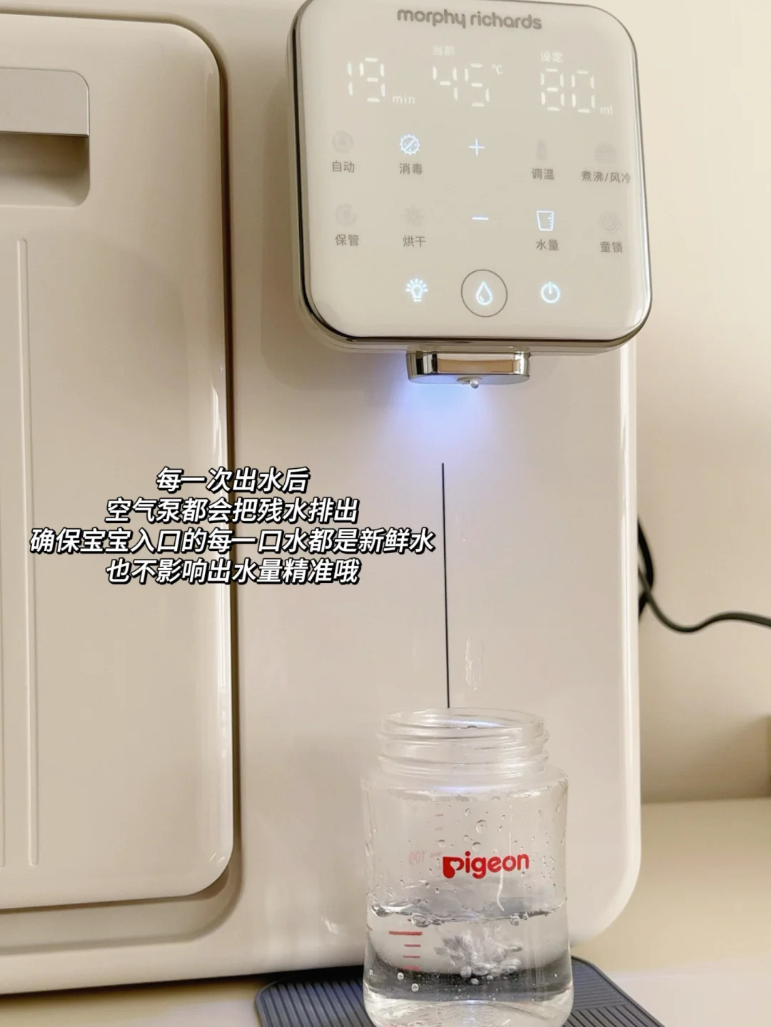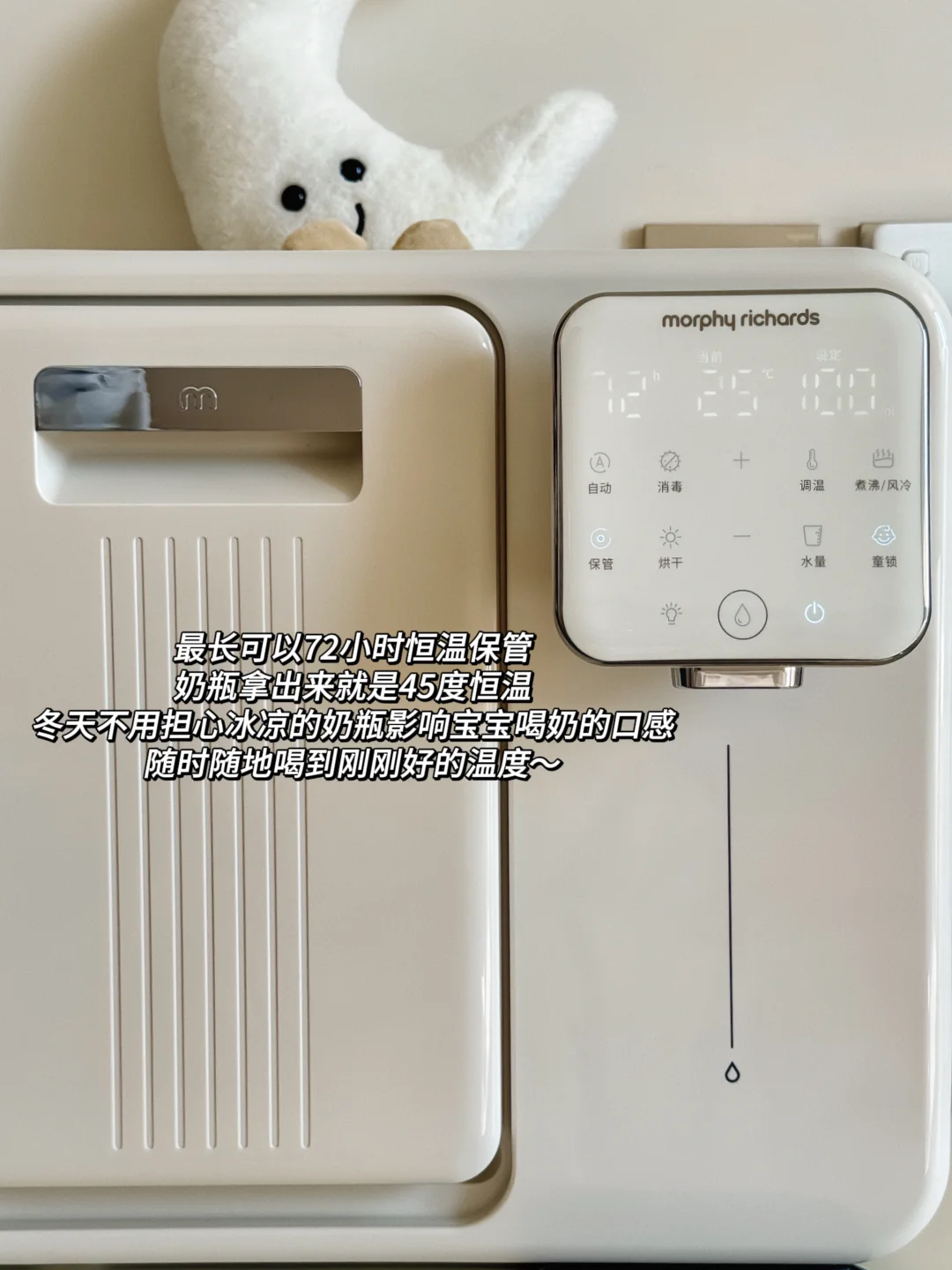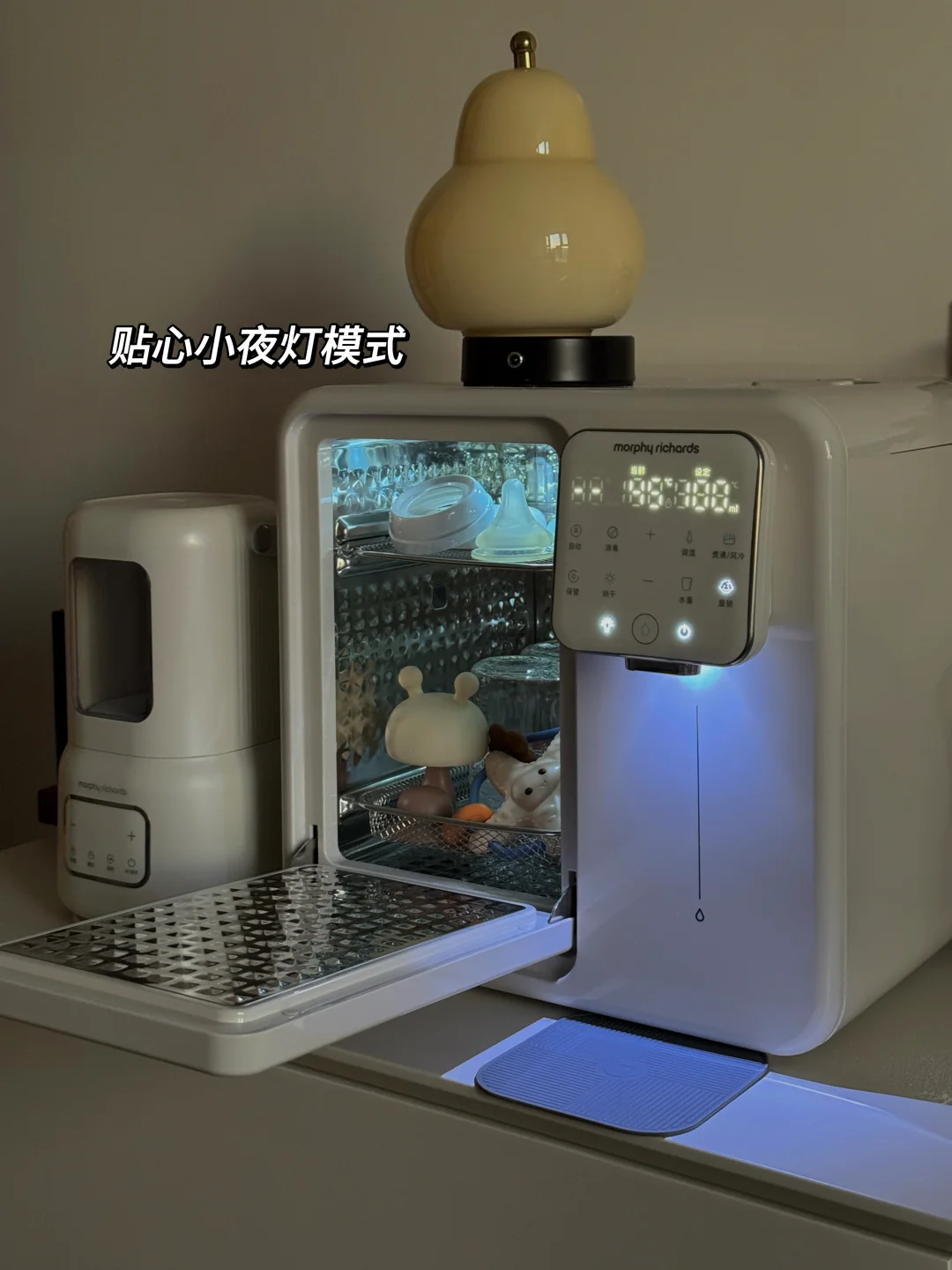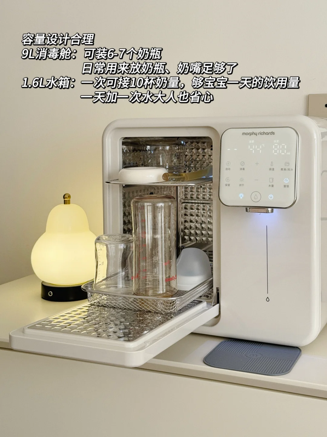 恒温舱1.6升大容量只需要一天加一次水就够宝宝一天的喝奶量而且出水口里面有一个空气泵每次都会把残水排出去这样每一滴水都是最新鲜的水对宝宝的安全更加友好~9升消毒舱放下6-7个奶瓶也是妥妥管够12颗灯珠和75℃高温巴氏双重消杀可以搞定99.999%的🦠双区独立操作,面板还特别简单易懂我妈都能使得明白我还配了他们家的摇奶器特别小巧,差不多是个保温杯的占地面积但是既能暖奶又能摇奶还搭配了静音罩 夜里是一丁点声音都听不见摇出来的奶特别均匀没有气泡!这三件套用下来我真的喜欢的不得了占地面积非常小巧而且足够满足我的日常所需爱了爱了!!