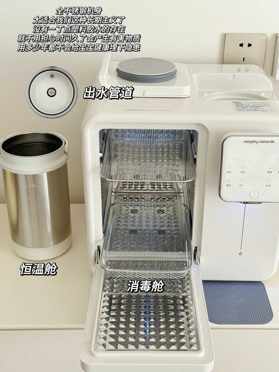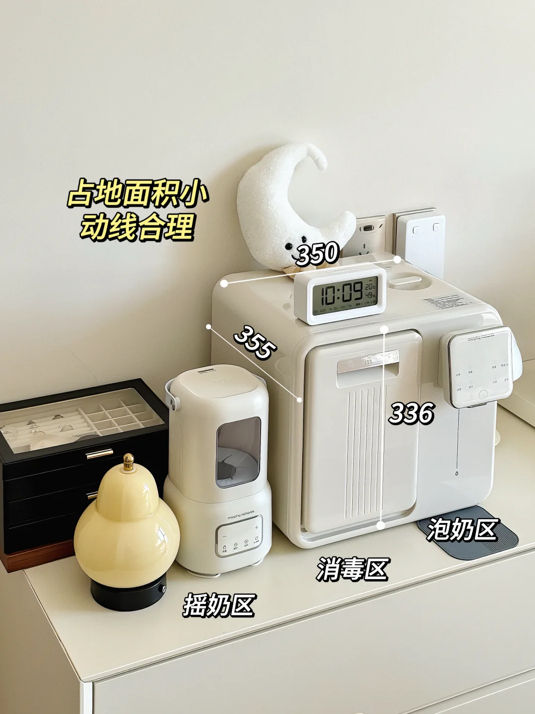 咱们寸土寸金的小户型家里多一个小朋友之后真的感觉本就没什么空间的家被塞的更加满满当当尤其是这个卧室只有10个平方还要塞下宝宝一套喂养台用品但你别说!还真给我找到了不占地的好东西!摩飞消毒泡奶二合一5603占地面积才一台笔记本的大小但是泡奶、消毒,通通都能搞定不锈钢内胆不担心有安全隐患特别适合我们这种长期主义