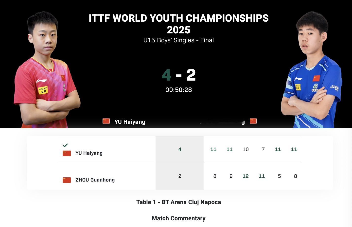 2025世界青少年乒乓球锦标赛丨U15男单决赛于海洋🇨🇳4-2周冠宏🇨🇳【11-8,11-9,10-12,7-11,11-5,11-8】于海洋🇨🇳获得2025世界青少年乒乓球锦标赛U15男单冠军🥇🎉周冠宏🇨🇳获得2025世界青少年乒乓球锦标赛U15男单亚军🥈