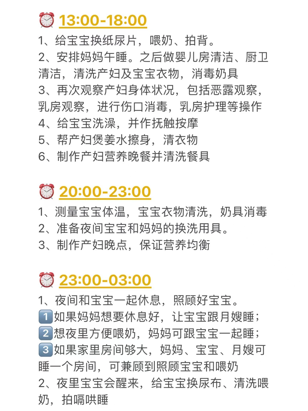 . 别走开! 如果你计划请月嫂 那么,这篇文章你可以作为参考 . 仅供参考👉月嫂工作时间细分 ⏰6:00-9:00 ⏰9:00-11:00 ⏰11:00-13:00 ⏰13:00-18:00 ⏰20:00-23:00 ⏰23:00-03:00 . 我会持续更新孕育干货 关注我,新手妈妈带娃不迷路