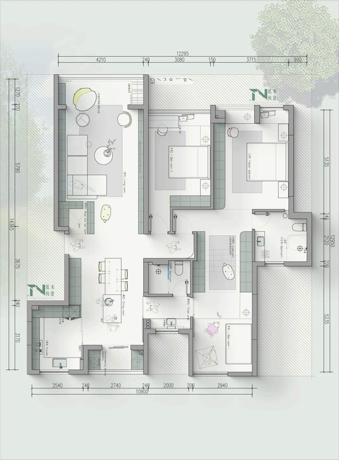 五版方案给你思路…… 设计需求: 一家四口 1、主卧套间(最好能有衣帽间,衣柜面积要大) 2、男孩房(包阳台)书桌学习 3、女孩房书桌学习 4、公卫干湿分离 5、家政阳台 6、入户门不对主卧门