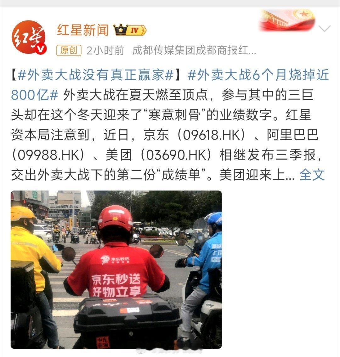 外卖大战6个月烧掉近800亿烧钱大战,三巨头集体亏损,商家也未得利,只剩一地鸡毛。赔本赚吆喝,外卖大战没有真正的赢家。