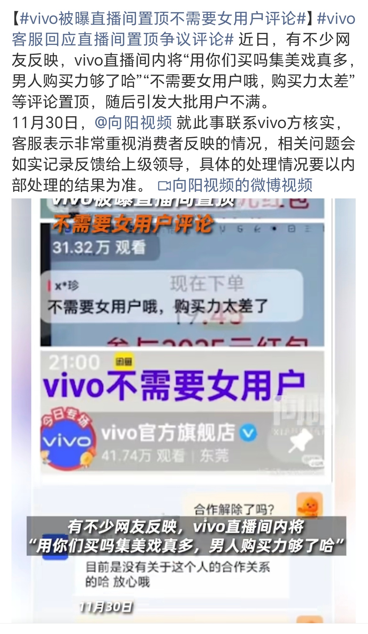 vivo被曝直播间置顶不需要女用户评论我的理解是这不可能是vivo官方的意思,而是直播间工作人员的发癫行为。谁不知道购买力更强的是女用户啊,而且vivo的女生用户应该很庞大的……