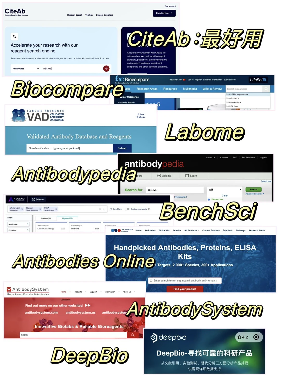 CiteAb, Biocompare、Labome、Antibodypedia、BenchSci、DeepBio