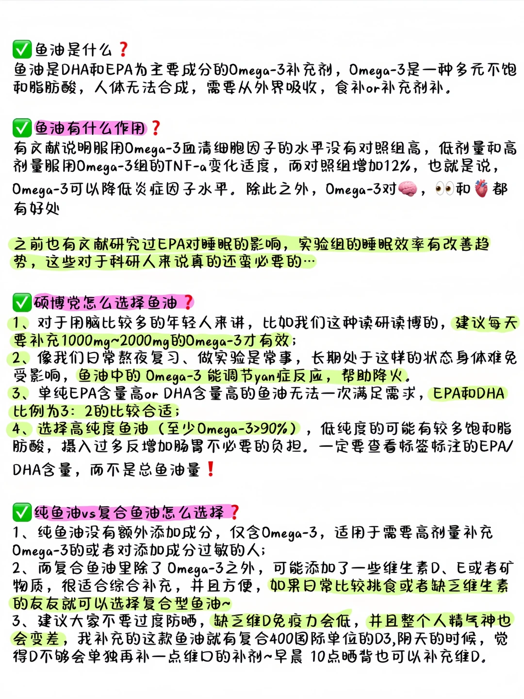 身边很多宝都吃鱼油包括我自己,但是鱼油千万种,选择不对容易“智商税”,今天就浅浅分析一下,具体内容大家可以看图~[棒R] ✅怎么选鱼油❓ 1、对于用脑多的年轻人,营养学家建议每天补充1000~2000mg的Omega-3才有效 2、EPA和DHA比例为3:2比较合适 3、选择高纯度鱼油(至少Omega-3>90%) ✅纯鱼油vs复合鱼油怎么选❓ 如果日常比较挑食或者缺乏维生素的友友就可以选择复合型鱼油~ 中国人普遍缺乏维D,缺乏维D免疫力会低下,并且整个人精气神也会变差!