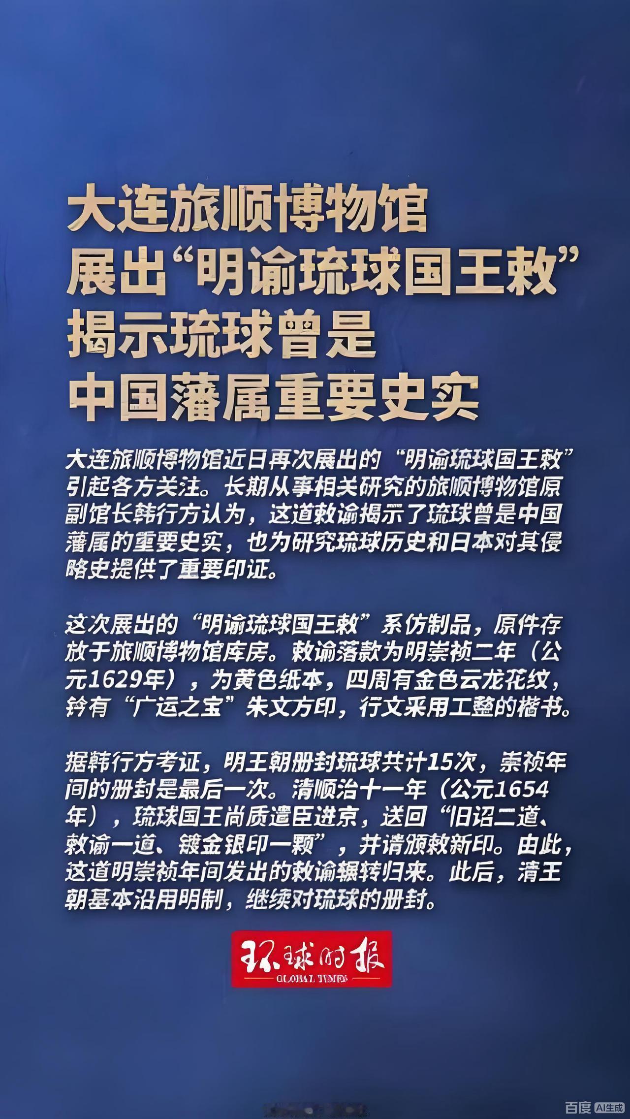 中日关系持续紧张,中国再打“琉球牌”。 中日关系在2025年11月以来急剧恶化,主要源于日本首相高市早苗的“台湾有事论”言论,以及中国随之而来的外交、经济反制措施。11月30日,中国大连旅顺博物馆展出明朝“谕琉球国王敕”,被视为再次打出“琉球牌”,以回应日本在台湾问题上的强硬立场。 11月17日,中国官方媒体《中国日报》旗下“起底工作室”发布冲绳原住民采访视频,强调1879年日本“吞并琉球”、二战后未恢复独立,复燃“琉球地位未定论”。 11月30日,大连旅顺博物馆展出明朝敕谕,馆原副馆长韩行方称此揭示琉球曾为中国藩属,为研究日本“侵略史”提供印证。