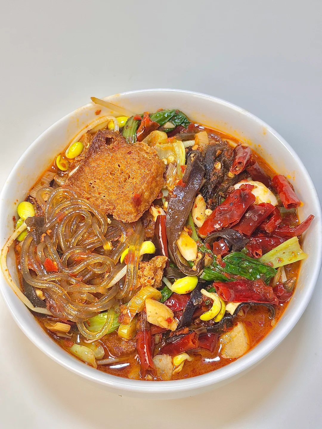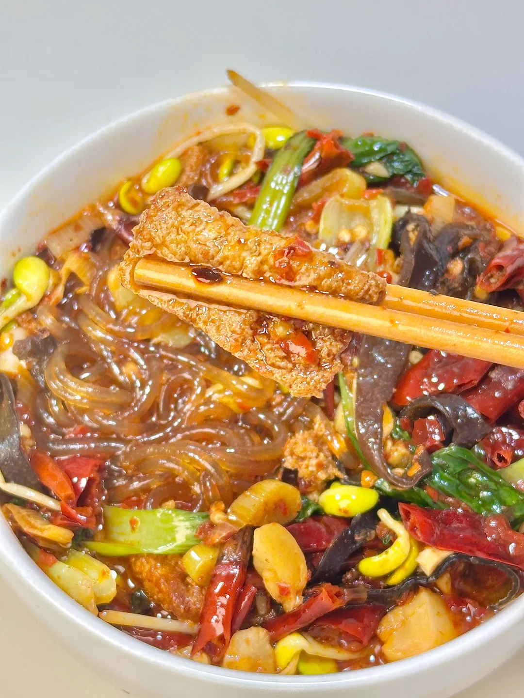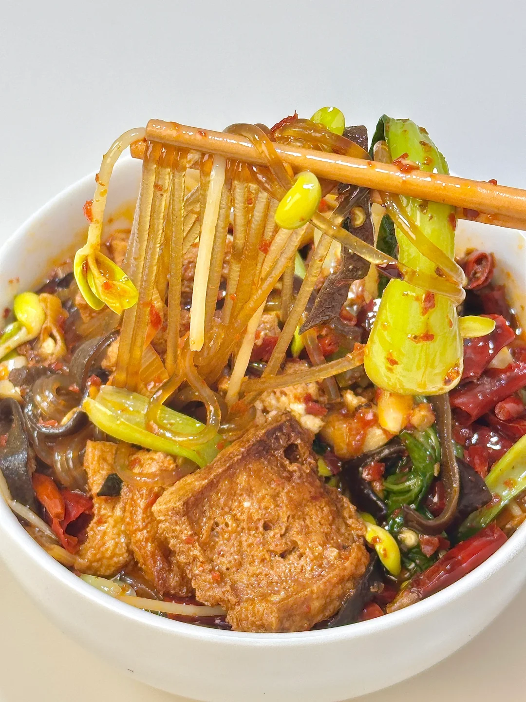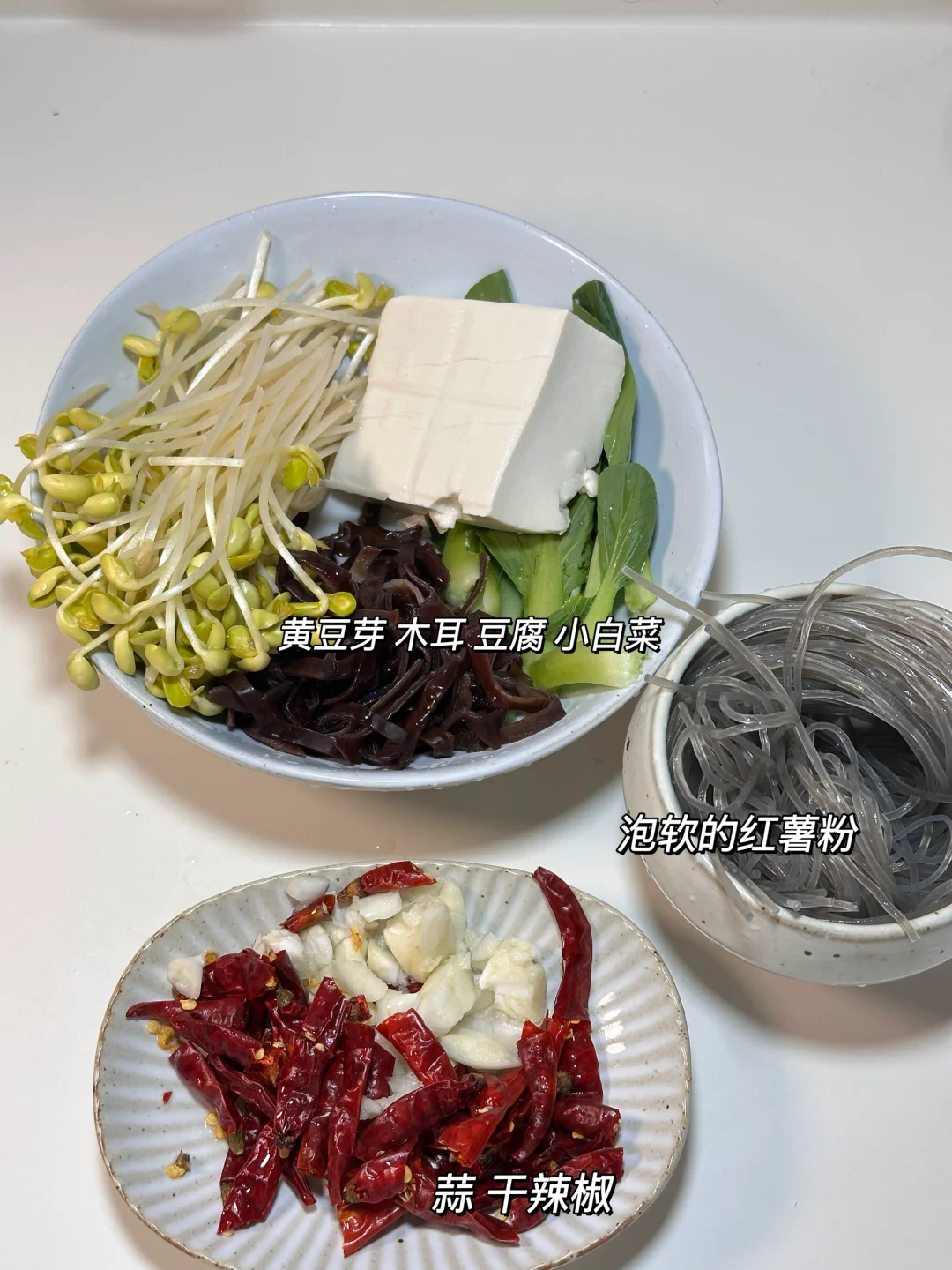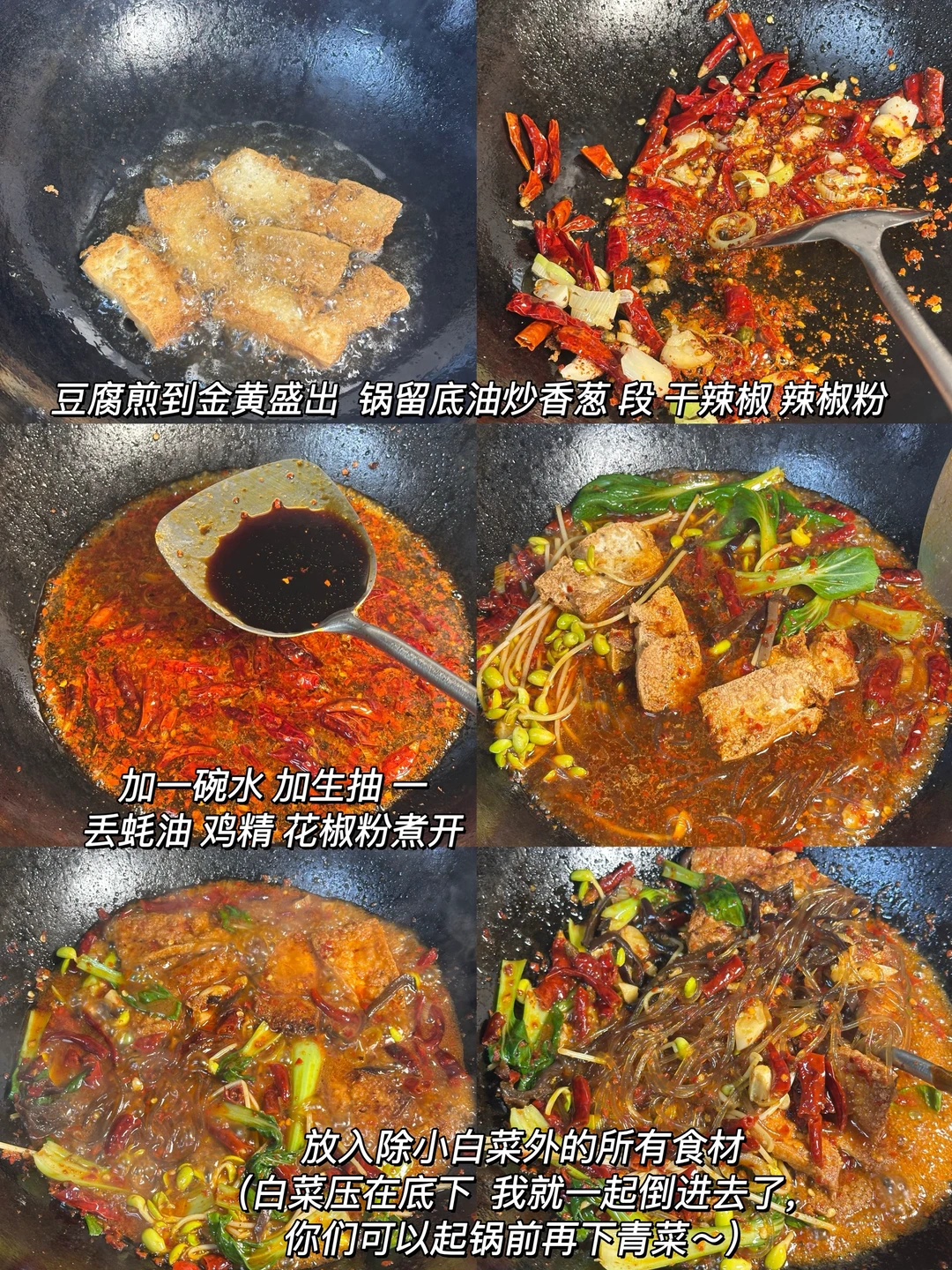 跟网友学的豆腐烩菜 豆腐煎透后再煮吸饱了鲜辣的汤汁,木耳 黄豆芽 小白菜每一样都好吃[哇R]红薯粉Q弹软糯,一碗根本不够吃~今天晚餐长这样 ✨食材:豆腐 木耳 小白菜 黄豆芽 红薯粉 干辣椒 葱 1️⃣:红薯粉提前泡发。豆腐切片煎到两面金黄变酥盛出备用,锅里留底油放葱白 蒜 干辣椒炒香,再加一勺辣椒粉炒出红油。加一碗水 调味加生抽,半勺蚝油 一丢鸡精 花椒粉大火煮开。放豆腐 粉条 木耳、黄豆芽转中小火煮五分钟。起锅前放小白菜🥬煮熟。 好好吃饭呀🖖🏻