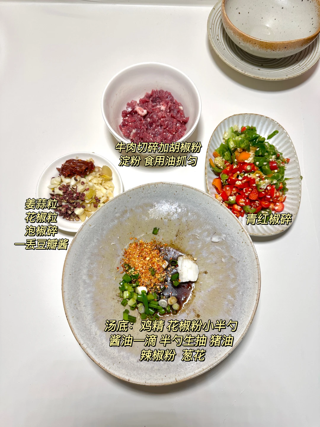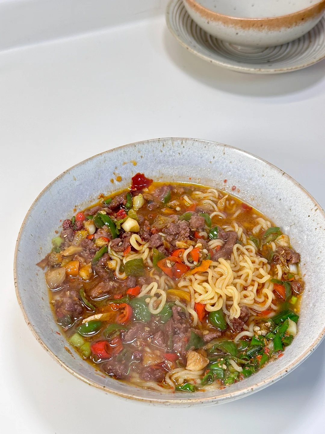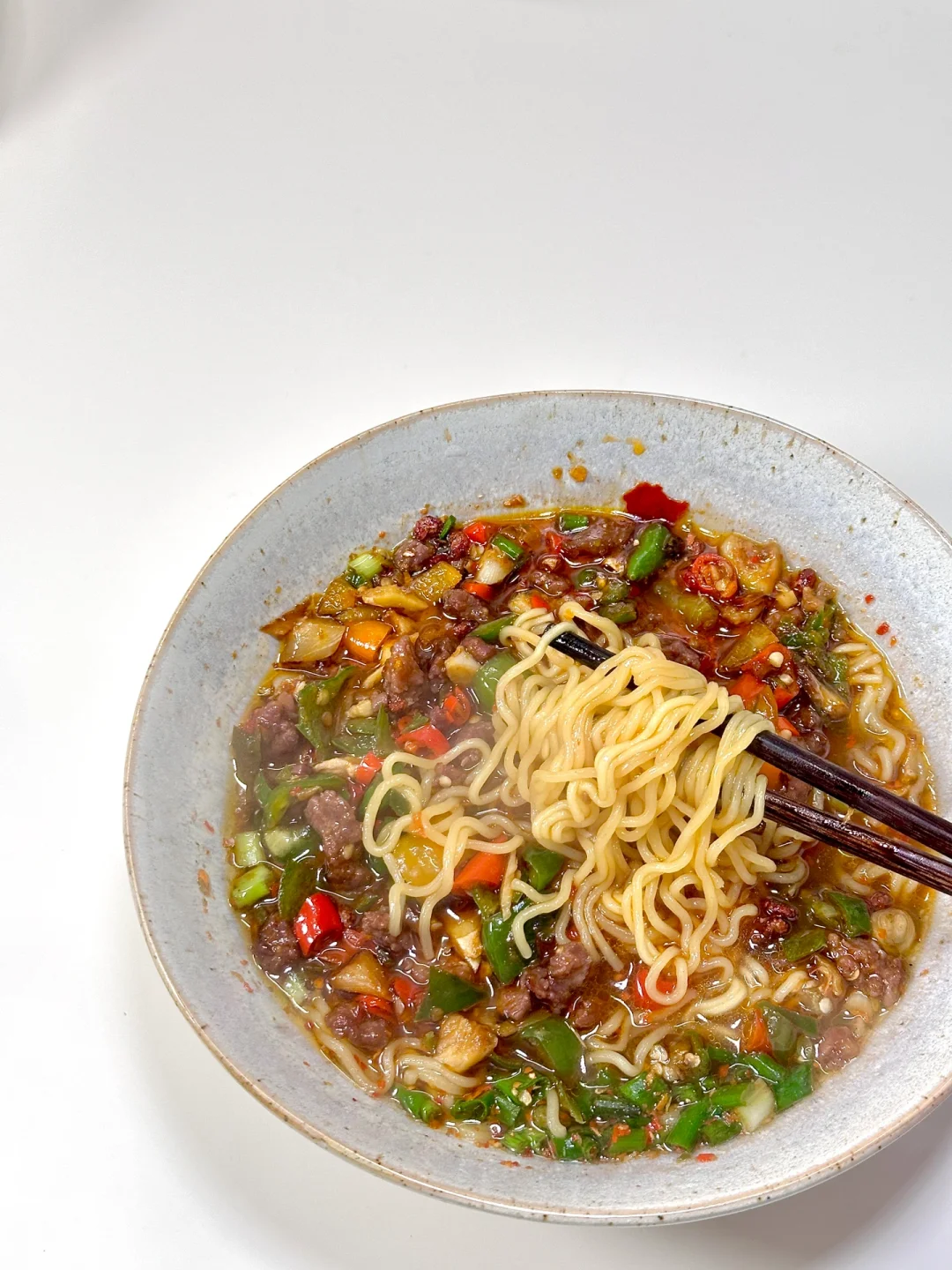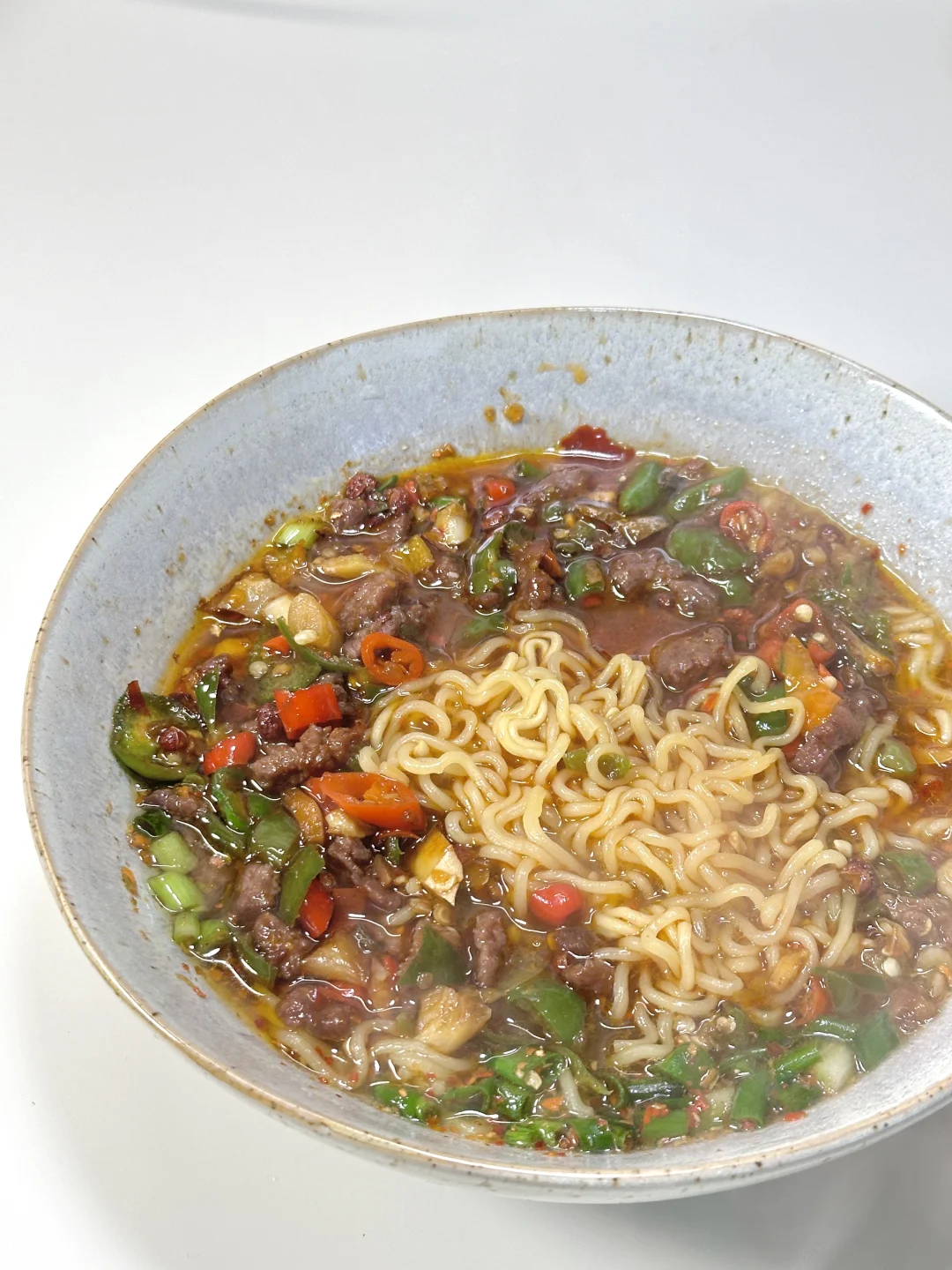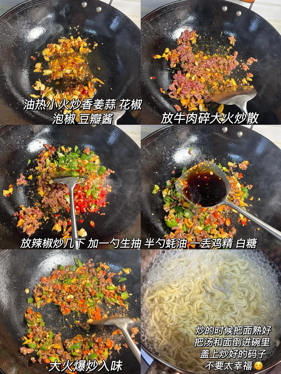 鲜辣过瘾的双椒牛肉面🍜 自己在家实现码子自由[大笑R] 真好嗦 好爱嗦粉嗦面[赞R][赞R] ✨食材:牛肉 姜蒜 泡椒 豆瓣酱 青红椒 面条 1️⃣:把所有食材按照图5️⃣准备好。 锅里倒油烧热放姜蒜 泡椒 花椒粒 豆瓣酱小火炒香,再倒入牛肉大火炒散 放辣椒碎炒几下,调味加一勺生抽,小半勺蚝油 一丢鸡精白糖爆炒入味。 炒的的时候把面煮好,把面汤倒入碗里化开调料,再放泡面和炒好的牛肉就可以开吃啦~牛肉自由[哇R] 好好吃饭呀🖖🏻