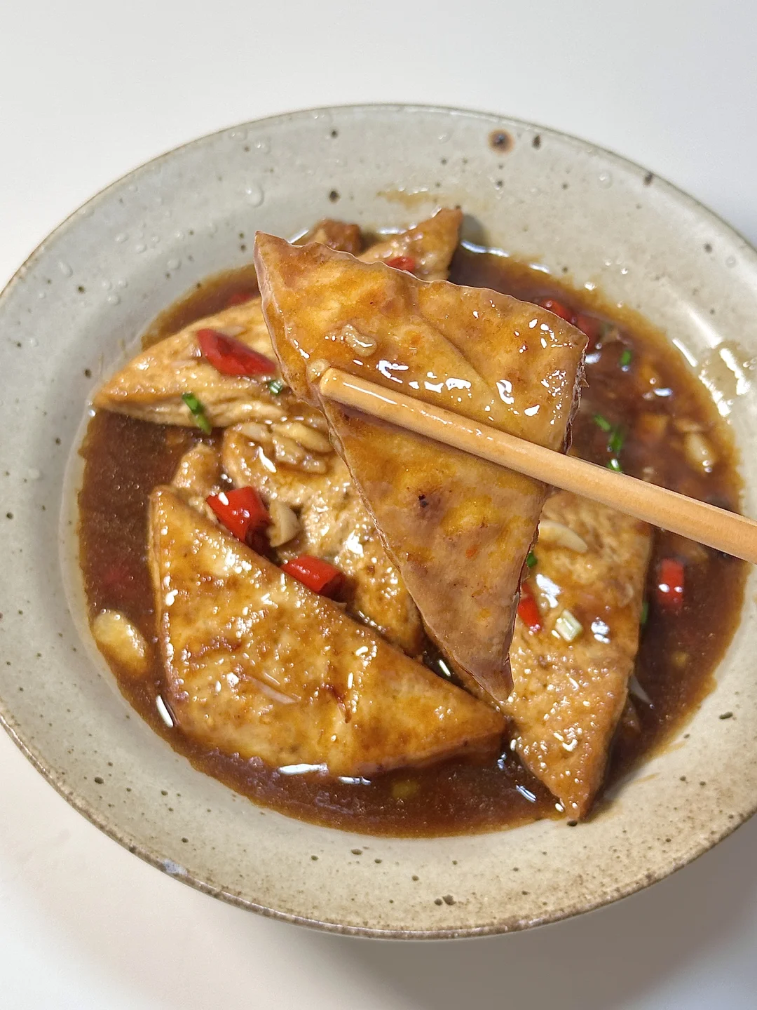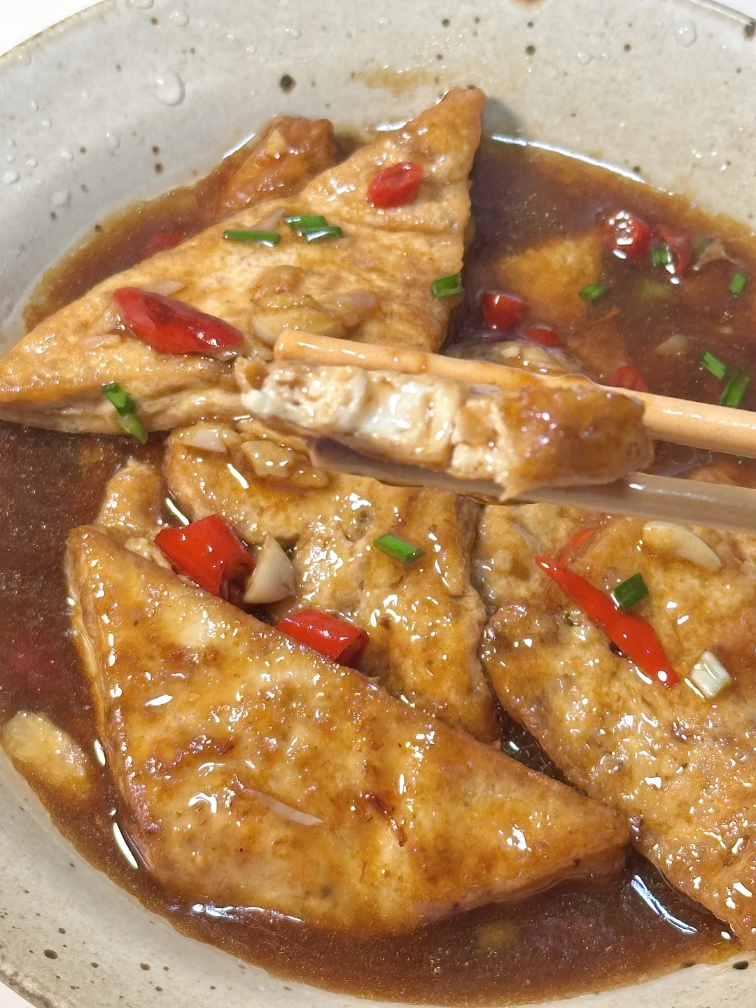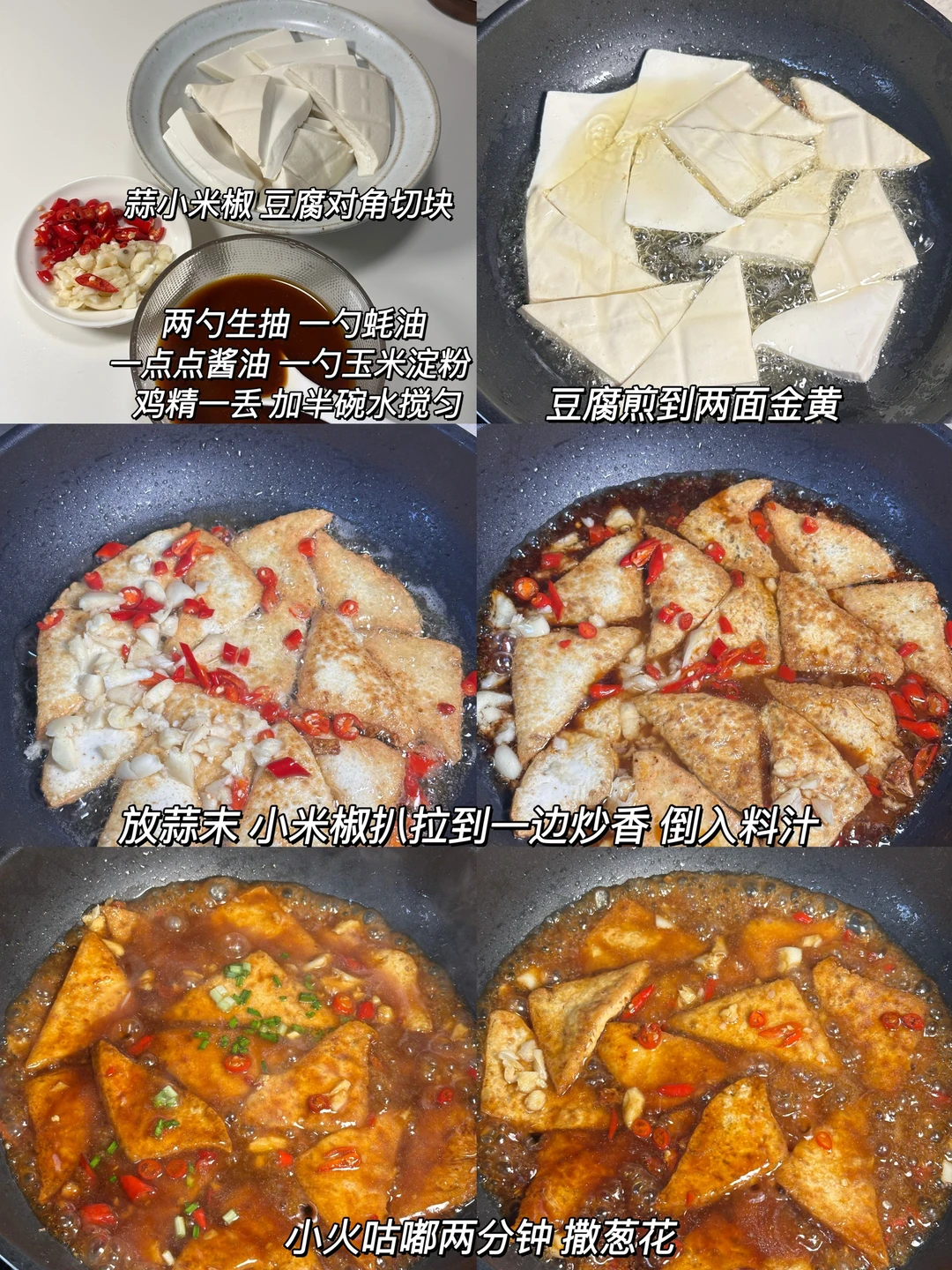 香煎豆腐 香香嫩嫩的好入味。几分钟下饭菜 做起来[派对R][派对R] 豆腐两面煎 吸爆汤汁一口下去真好吃😋今天晚餐长这样 ✨食材:嫩豆腐 蒜末 小米椒 葱 1️⃣:豆腐切块备用。酱汁:(两勺生抽 一勺蚝油 一点点🤏酱油、一勺玉米淀粉、一丢鸡精加半碗清水搅匀) 不粘锅倒油 放豆腐煎到一面金黄再翻面 煎到两面金黄放蒜 小米椒炒香,倒入酱汁(倒之前记得再搅拌匀 淀粉会沉淀)小火咕嘟两分钟,中途用锅铲翻拌几下。起锅前撒葱花增香 好好吃饭呀🖖🏻