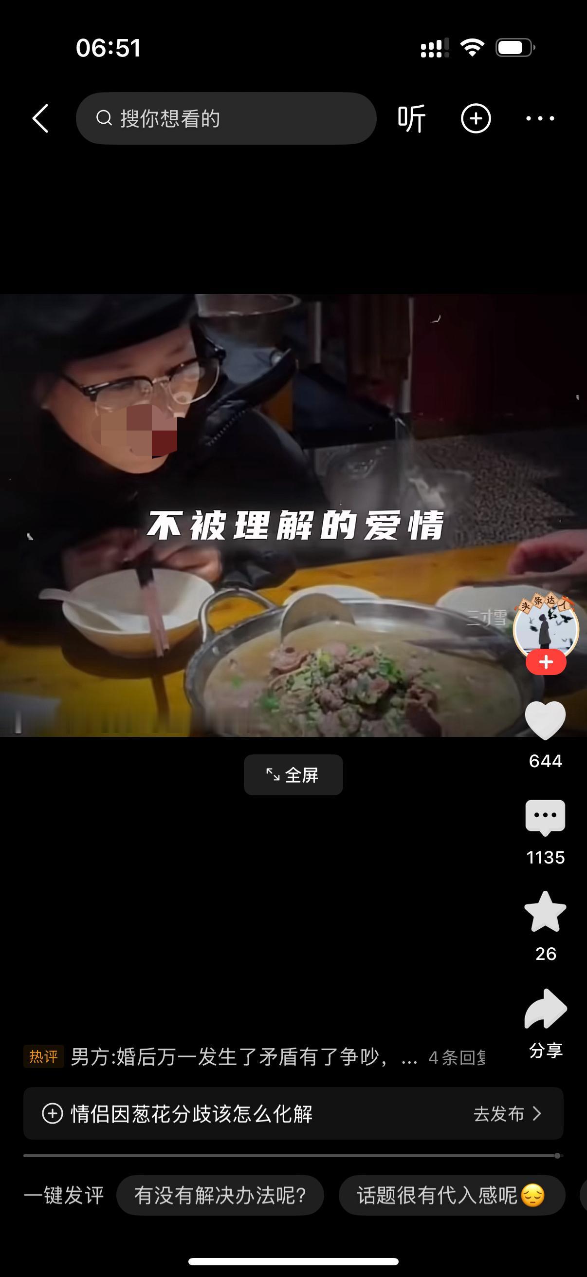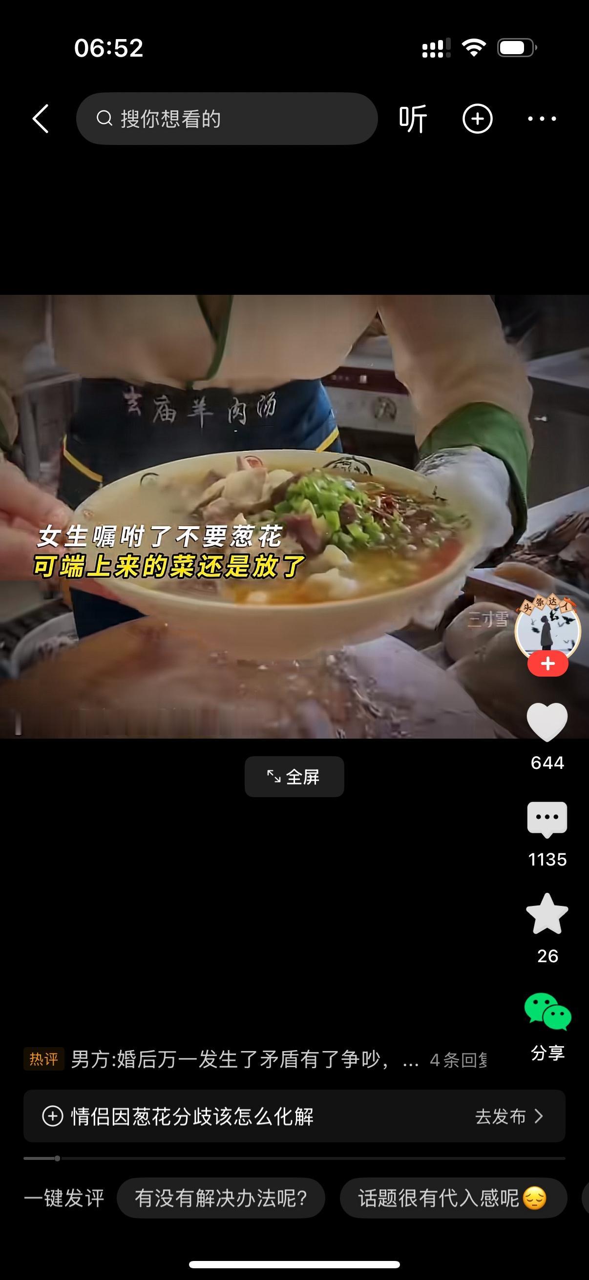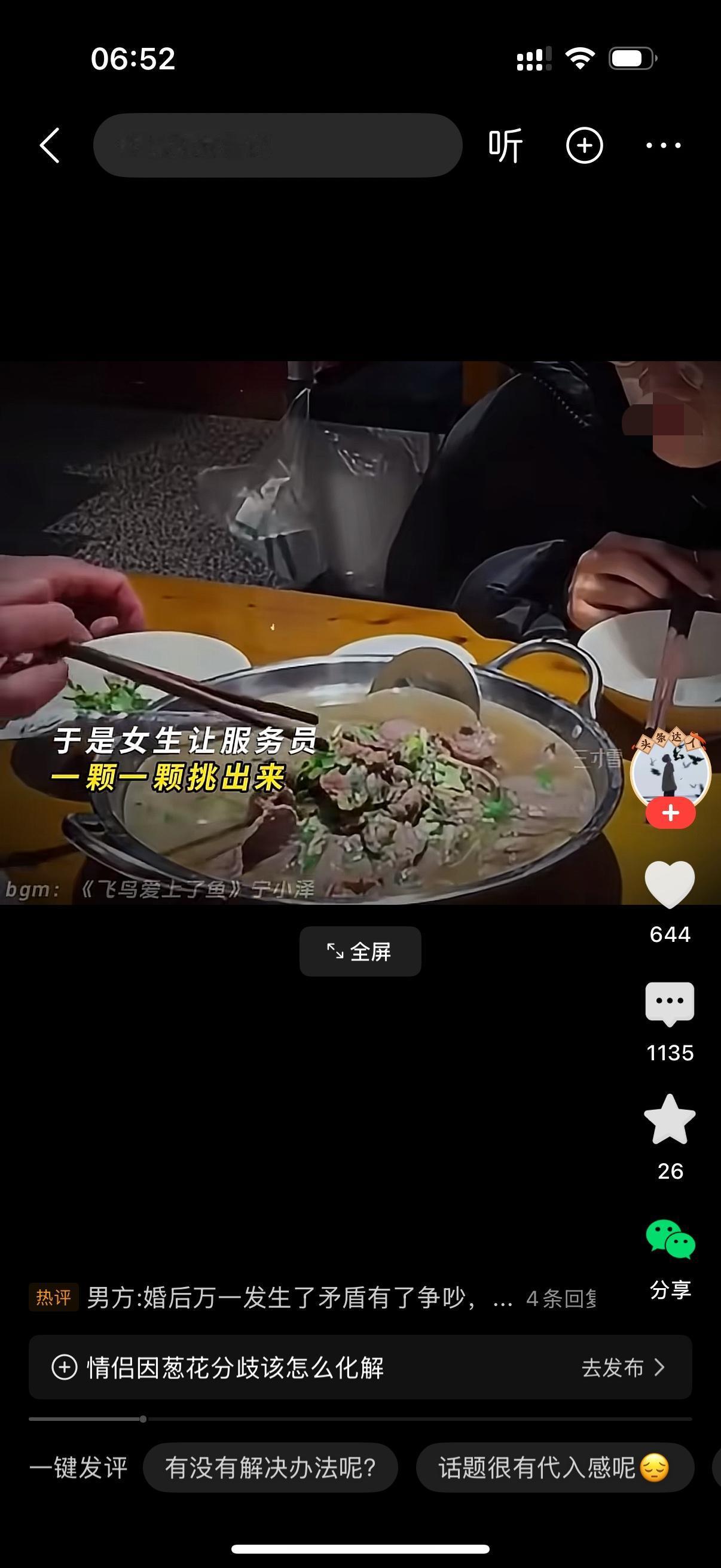 女生嘱咐服务员不要放葱花,可是端上来的菜还是放了。女生让服务员一颗一颗挑出来。服务员挑干净后,女孩开心的笑了。旁边的男友却表示开心不起来,还说女孩不应该为难服务员的。女生看男友不站在自己这边,伤心流泪了。