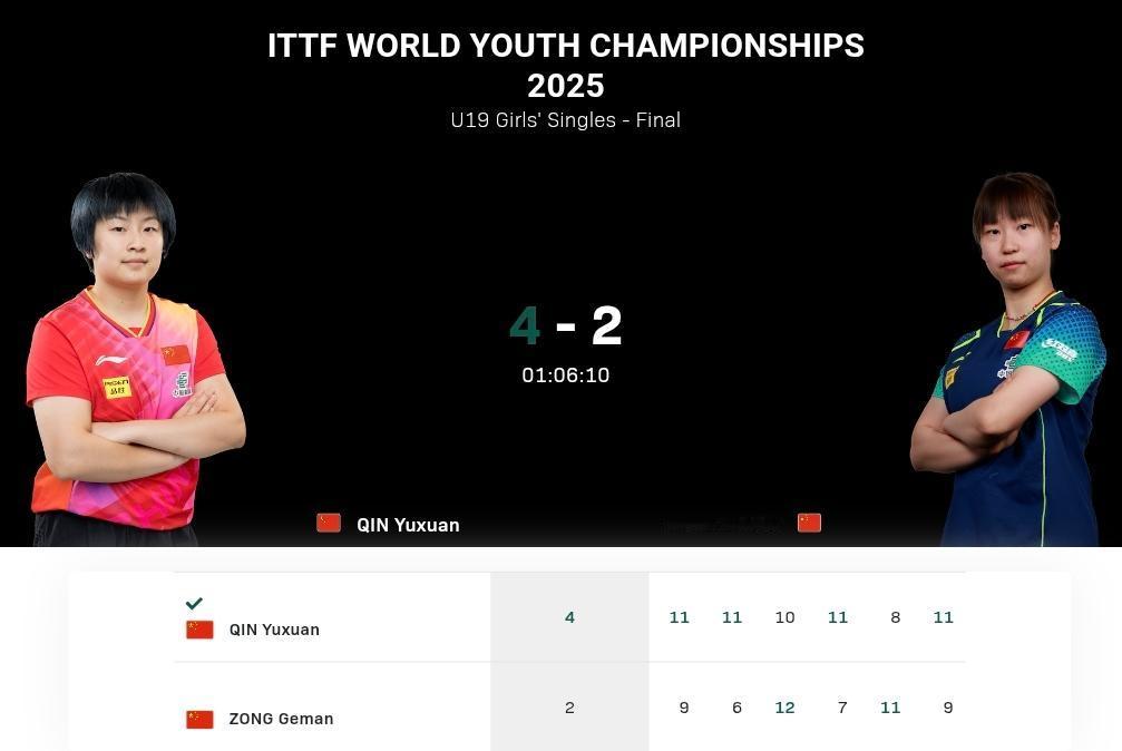 世青赛丨覃予萱获U19女单冠军! 国际乒联世青赛 U19女单决赛在国乒两名队员之间进行,覃予萱与纵歌曼激战六局,覃予萱4-2胜出获得冠军,纵歌曼收获亚军! 两人在半决赛表现出色,覃予萱战胜了赫尔希,纵歌曼战胜了日本选手小盐悠菜! 虽然两人配合在女双决赛输给了赫尔希和格丽赛尔,但覃予萱在半决赛成功复仇赫尔希,表现不错!恭喜两位国乒选手,继续加油!