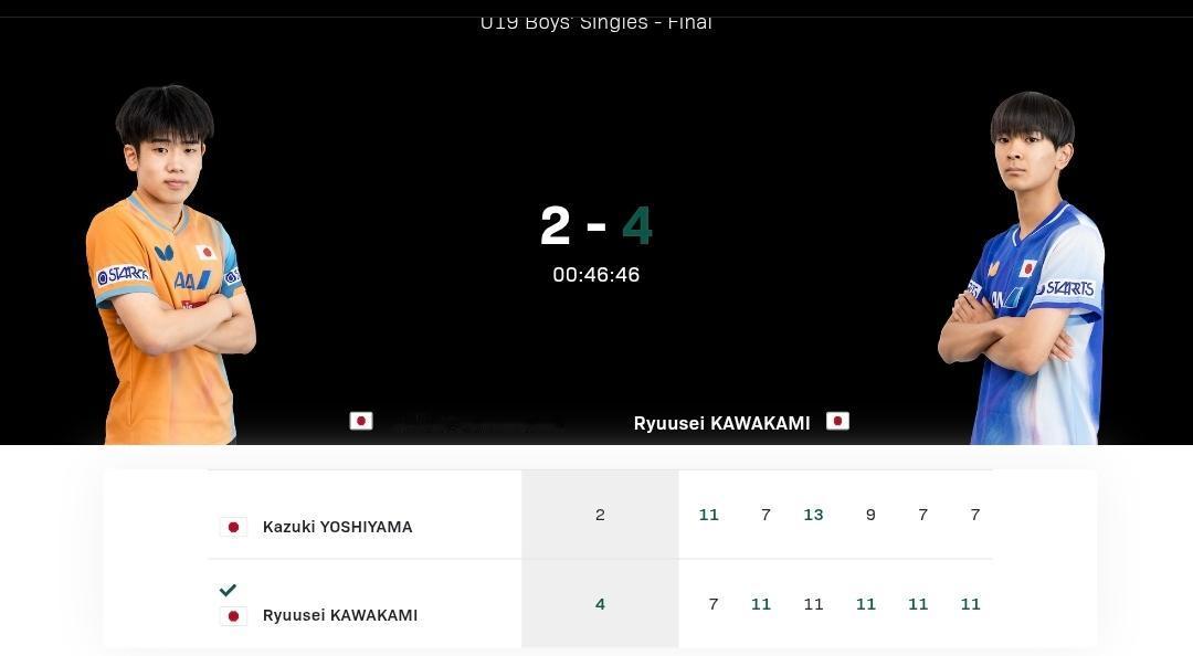 世青赛丨川上流星获U19男单冠军! 国际乒联世青赛 男单决赛在日本两名选手之间进行,最终川上流星以大比分4比2战胜吉山和希获得冠军! 国乒两名选手折戟半决赛,温瑞博3-4不敌川上流星,李和宸1-4不敌吉山和希,两人输的有些可惜,日本两名队员表现也确实出色,尤其川上流星,今年才16岁,已表现出相当的天赋和比赛能力,假以时日又是另一个张本智和! 国乒梯队建设确实比日本要差很多,继续加油吧!