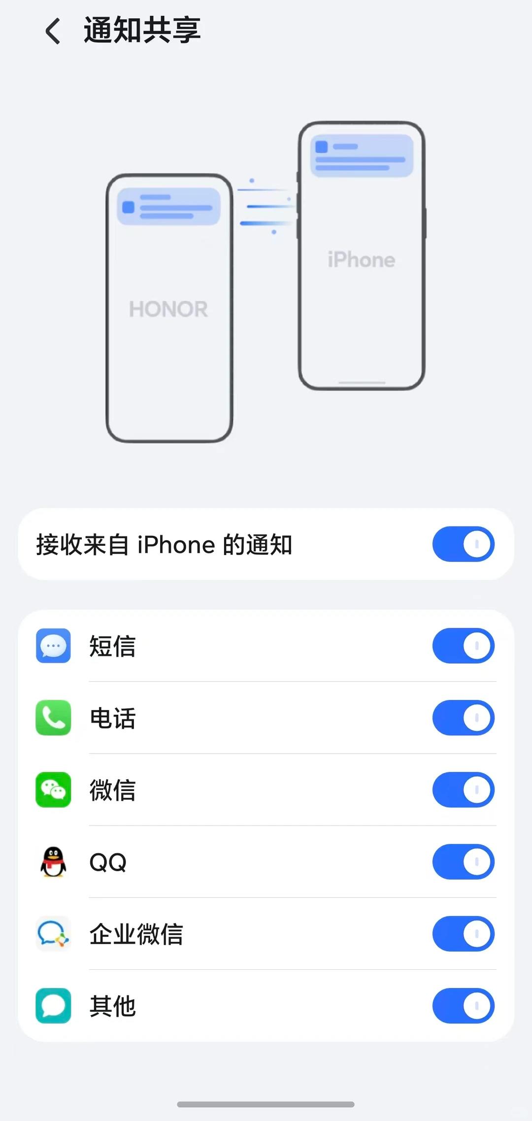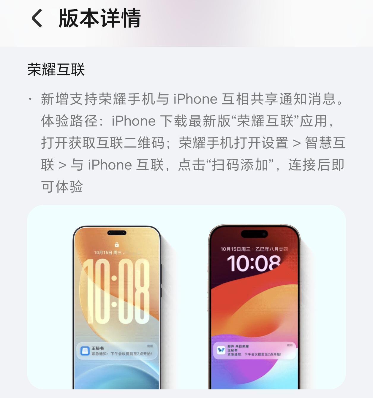 荣耀的管理层实在太狠了,系统开始全面向iPhone靠拢,生态兼容性直接拉满 最近把手里的荣耀Magic8 Pro升级到了最新的116版本,发现新增了iPhone互联功能,开启之后我可以直接在荣耀手机上面接收iPhone的通知,包括短信、电话、微信等多个类目 对于双持党来说这绝对是好消息,据说荣耀500系列目前也支持这个功能,其他的机型应该会陆续推送 加上荣耀天生自带跟华为HarmonyOS互传的优势,荣耀这次又耀耀领先了