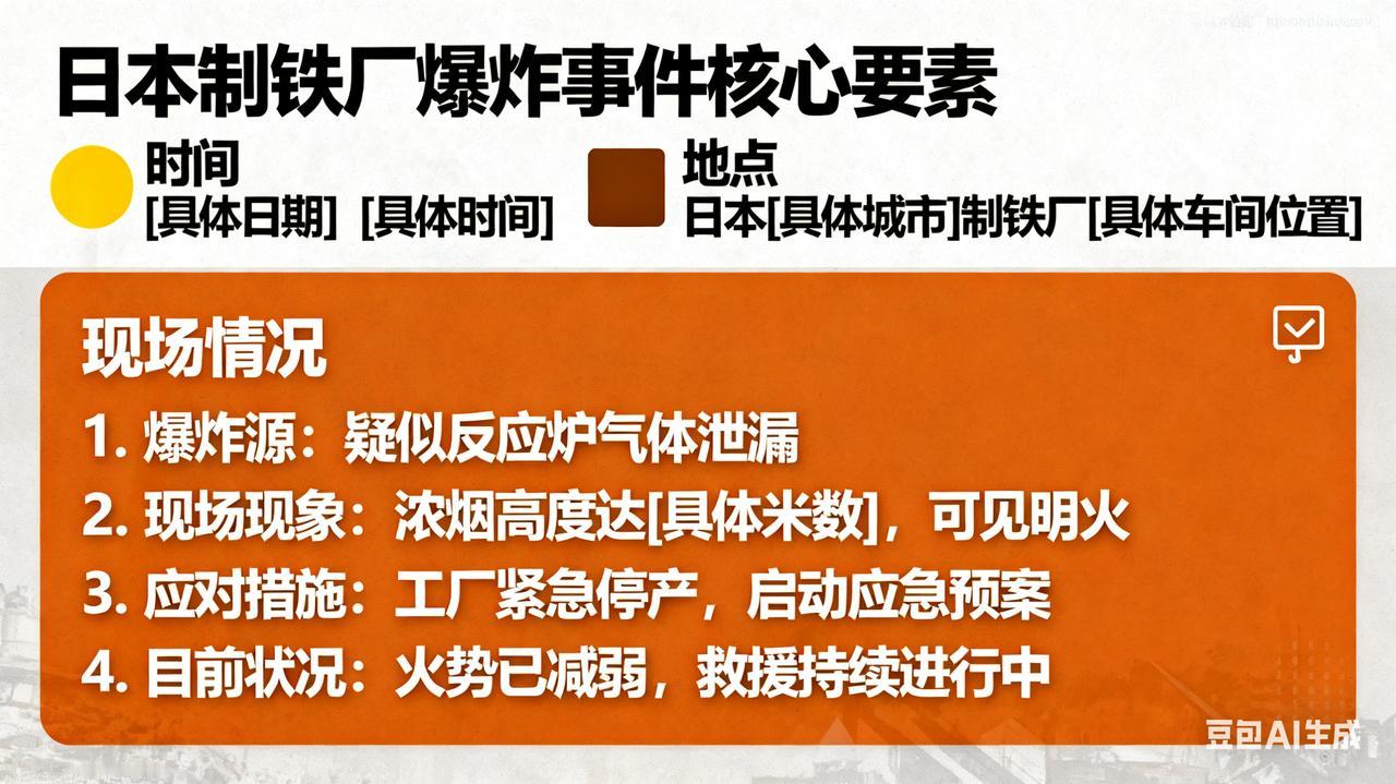 凌晨巨响!日本制铁厂爆炸火光映天 北海道室兰市的深夜本应寂静,凌晨1点的一声巨响却划破夜空——日本制铁厂突发爆炸,橙色火焰裹挟着蓝白色火光冲天而起,滚滚黑烟像墨汁般染黑半边天,几公里外都能感受到热浪灼人。 附近居民在睡梦中被震醒,窗外的恐怖火光让人心惊肉跳,纷纷裹着衣物逃离住所,有人慌乱中忘记带证件,只攥着家人的手狂奔。消防车辆呼啸而至,水枪喷射的水柱在大火面前显得格外单薄,灭火行动连夜持续,现场弥漫着刺鼻的焦糊味。 钢铁厂爆炸不仅摧毁了生产设施,更给周边居民的生活蒙上阴影。厂房附近的房屋玻璃被震碎,道路布满碎石,人们望着浓烟滚滚的厂区,满脸焦虑与无助。安全生产从不是一句口号,而是守护生命的底线。希望火势能尽快得到控制,也盼着这样的安全事故不再重演,让每个普通人都能在深夜安睡,不必被突发的灾难惊醒。
