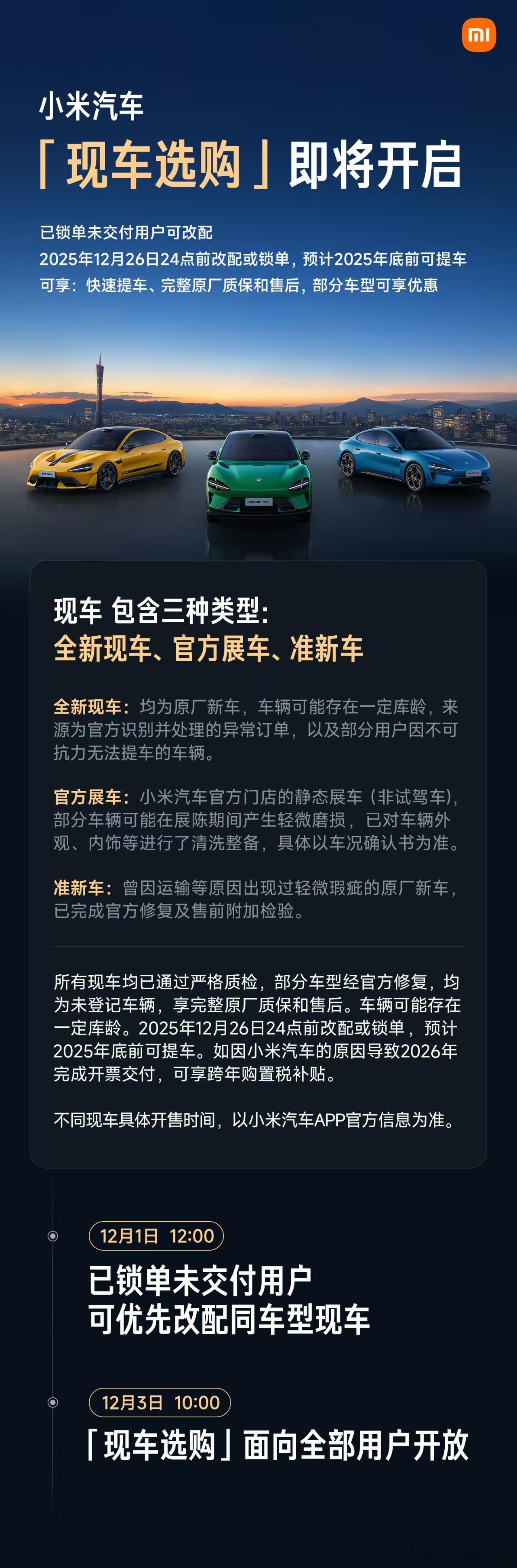 小米汽车即推出「现车选购」,针对的是已锁单未交付的用户。这些现车来源是官方识别并处理的异常订单以及部分用户因不可抗力无法提车的车辆、展车和准新车。新能源汽车小米汽车