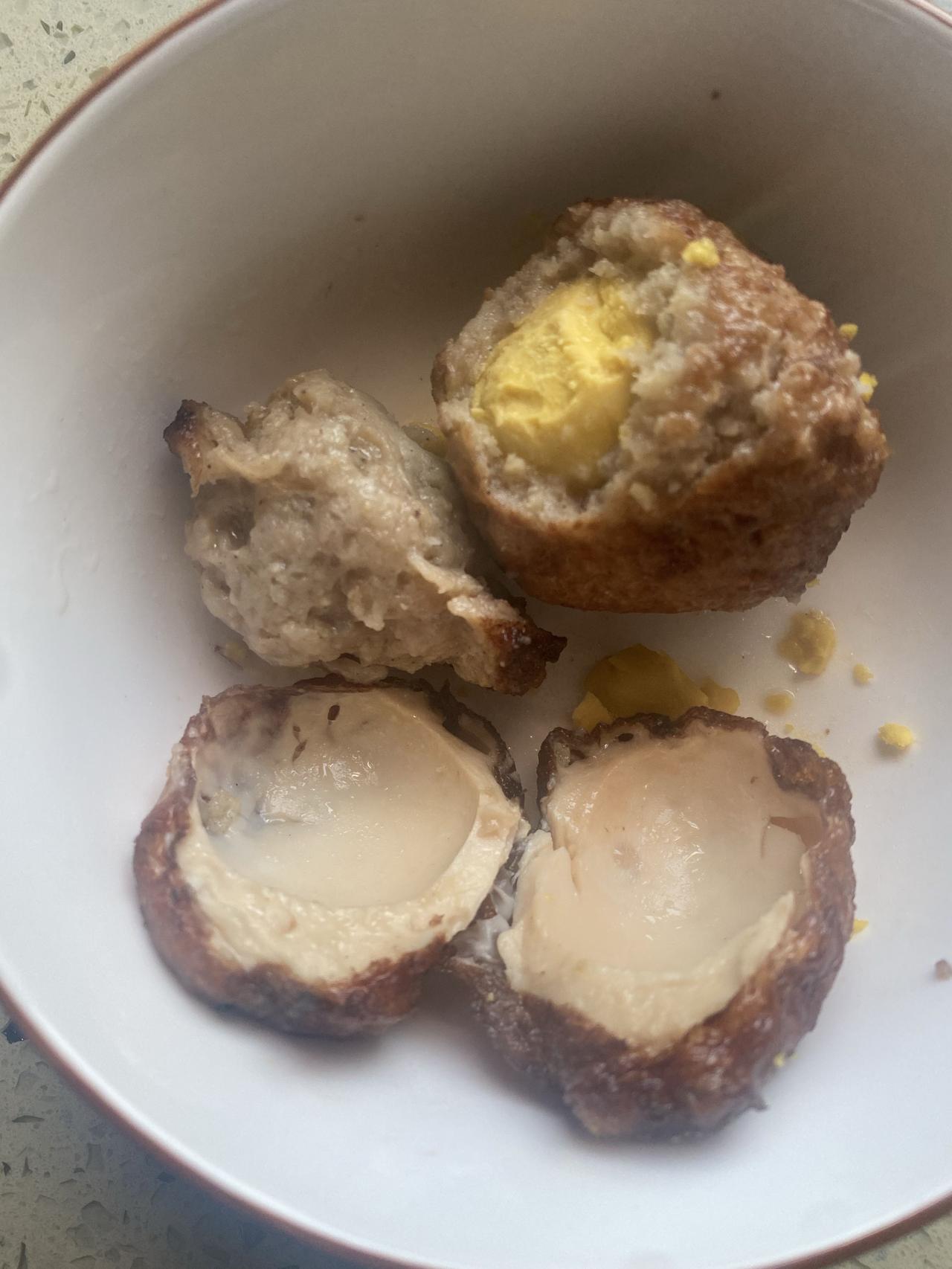 昨天去参加婚礼,这个菜第一次吃,表面都像炸的丸子,一个是肉馅裹着鸡蛋黄,一个是鸡