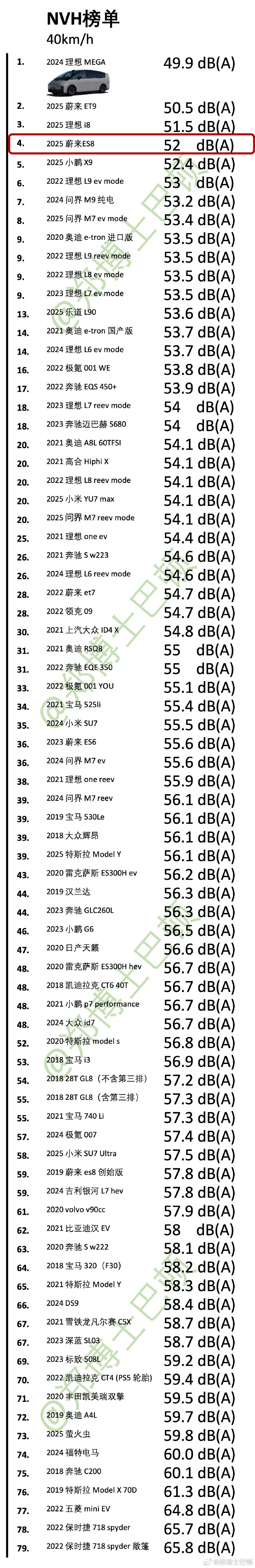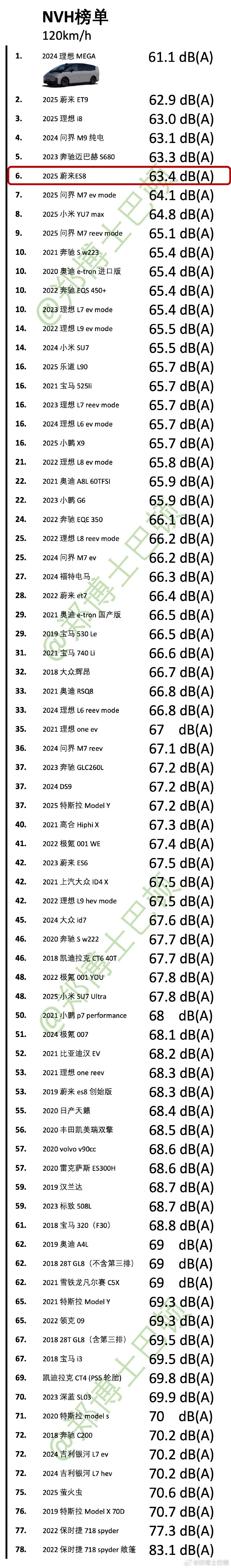 来自郑博士的NVH数据中心,第63期新增2025蔚来ES8。静态排名第3,仅次于小米 YU7 和自家 ET940km/h 排名第4,仅次于理想MEGA,自家 ET9 和理想 i880km/h 排名第3,仅次于理想MEGA,自家 ET9120km/h 排名第6,仅次于理想MEGA,自家 ET9,理想 i8,问界 M9 纯电和迈巴克 S680看得出来应该是低速状态 NVH 非常强,高速状态造型影响比较大。不过和发布会官方公布的 NVH数据有些许出入(主要是排名),你们觉得是哪里的原因?这榜单今天又要吵起来了吧?