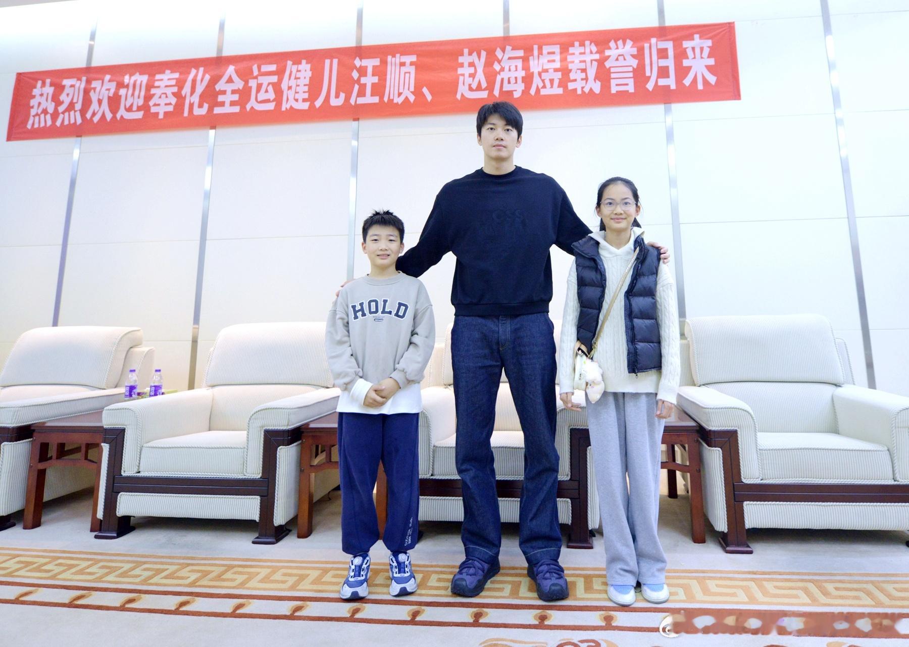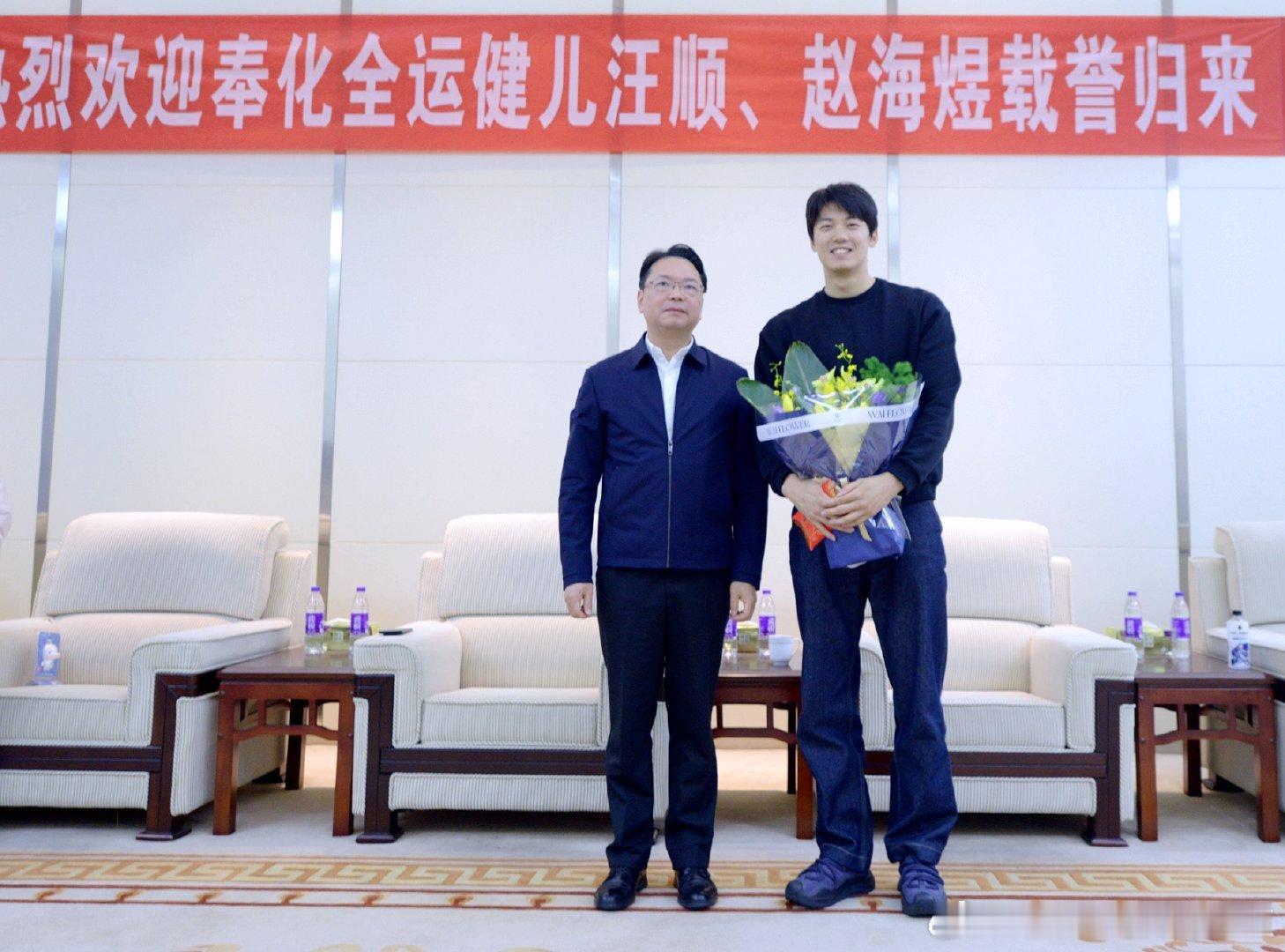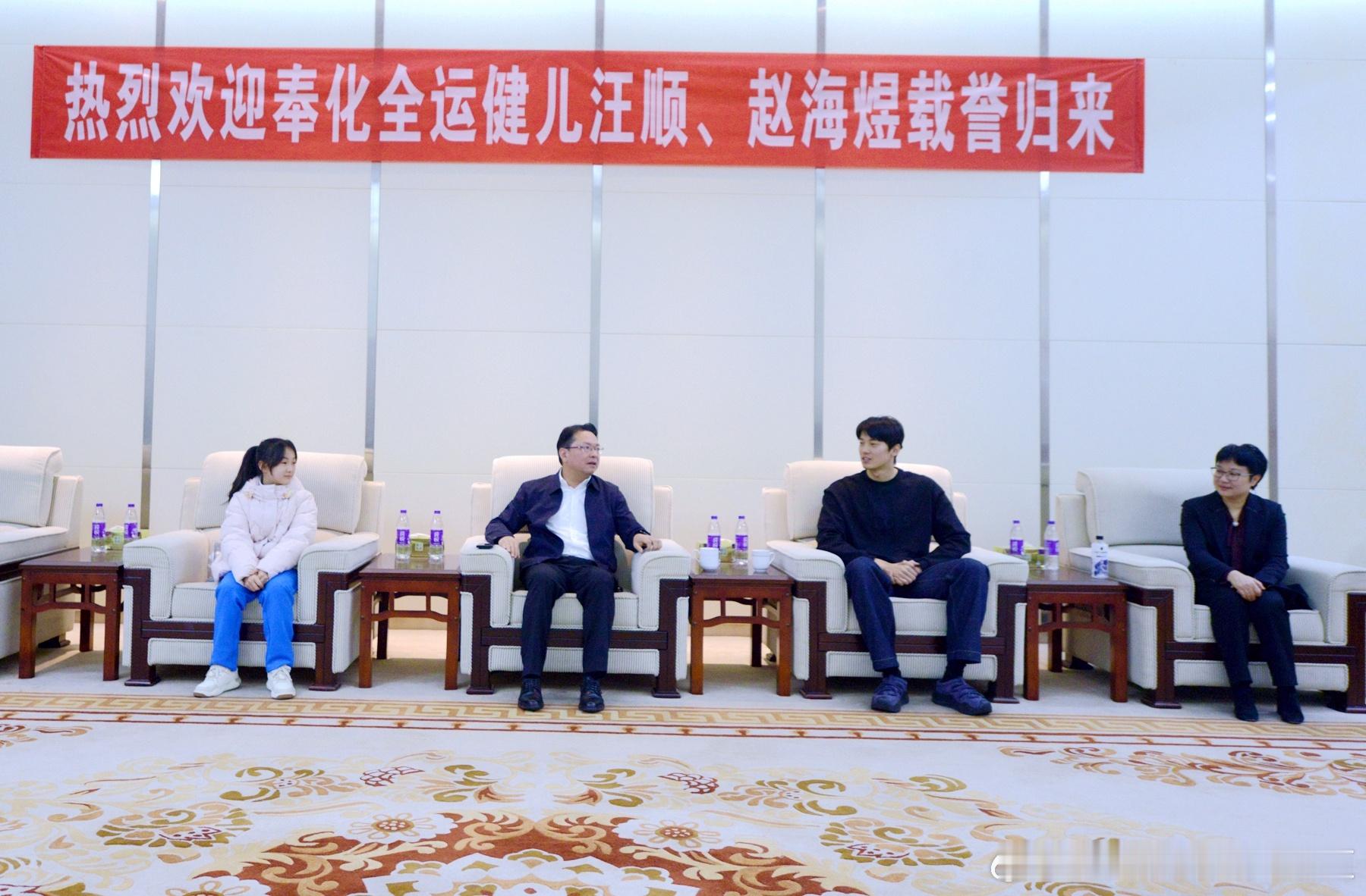 11月30日上午,宁波市奉化区领导会见奉化区全运会冠军汪顺、赵海煜一行。汪顺的第