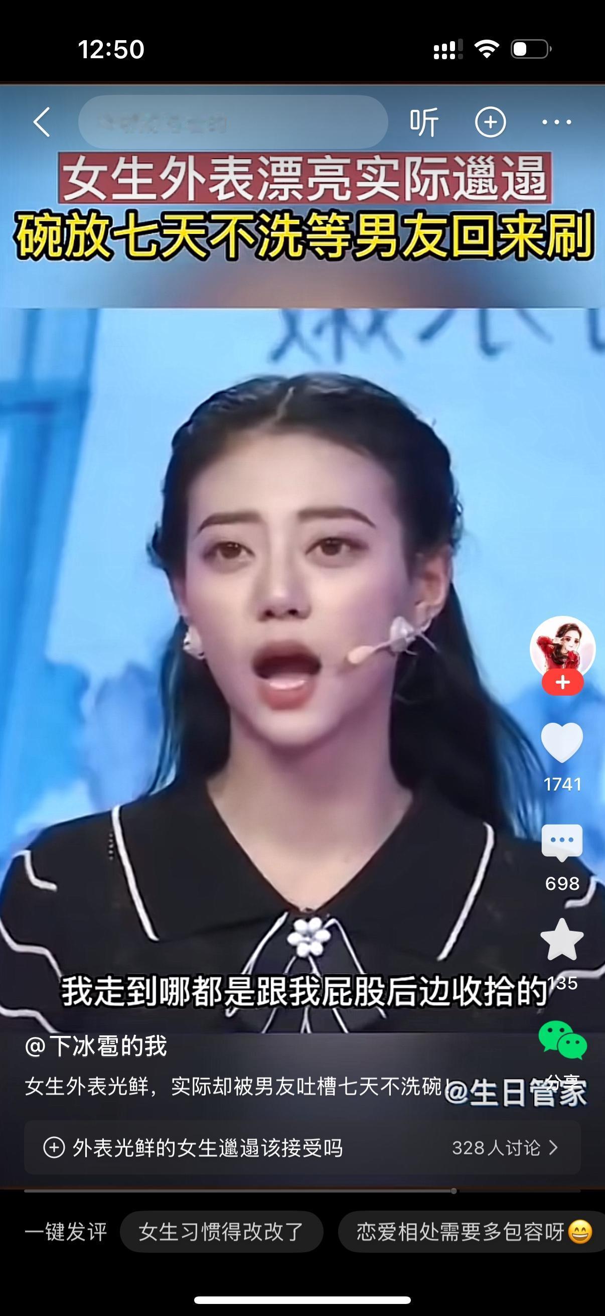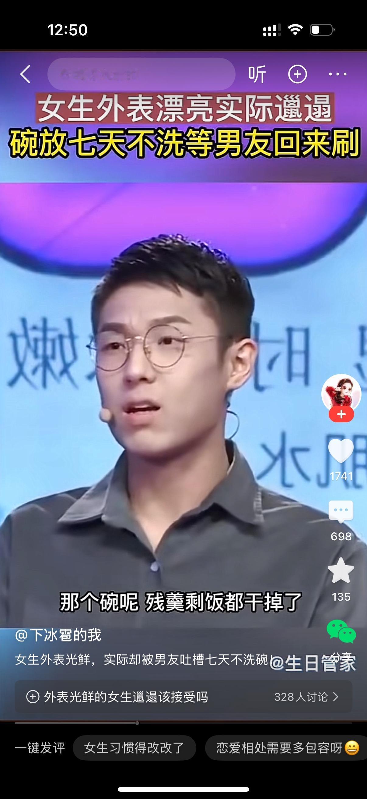 女生外表漂亮实际邋遢。男友说她在厨房好不容易做一次饭,碗放在那里一个星期不洗,就等着男友周末过来洗。那碗里的残羹冷炙都臭了。女生让男友闭嘴。男生继续说,女友换下来的衣服也不放洗衣机,就等他来放来洗。女友说我从小就这样,我爸妈都是在我屁股后面帮我收拾,我啥都不用干。你接受不了,就别跟我在一起。不要一边享受着我的美貌,一边还要我做家务。男友直接无语,长得漂亮就啥都不干?