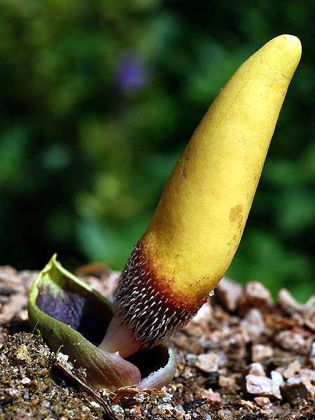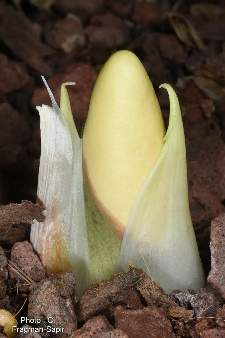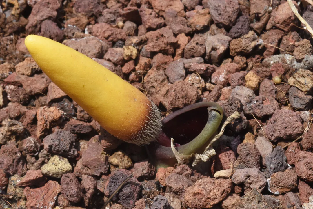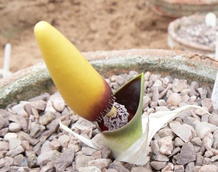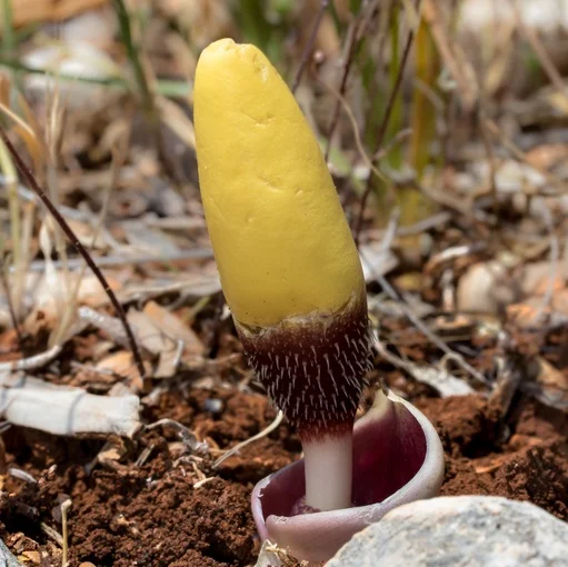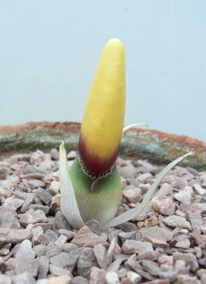 稀有球根Biarum ditschianum 这是一个仅在1989年被描述的物种。天南星科,破土芋属。 紫红色的花苞是如此之短,以至于它们被缩小到只是一个边缘,或者略高于地面水平面,有一个巨大的,非常肥大的金色花苞从中心伸出。花穗的基部清楚而明显地被朝下的白毛覆盖。除了惊人的和有趣的花序,这个菌株的叶子也是非常装饰性的,是一个很好的蓝绿色的阴影,叶片明显地浮雕着花边图案。