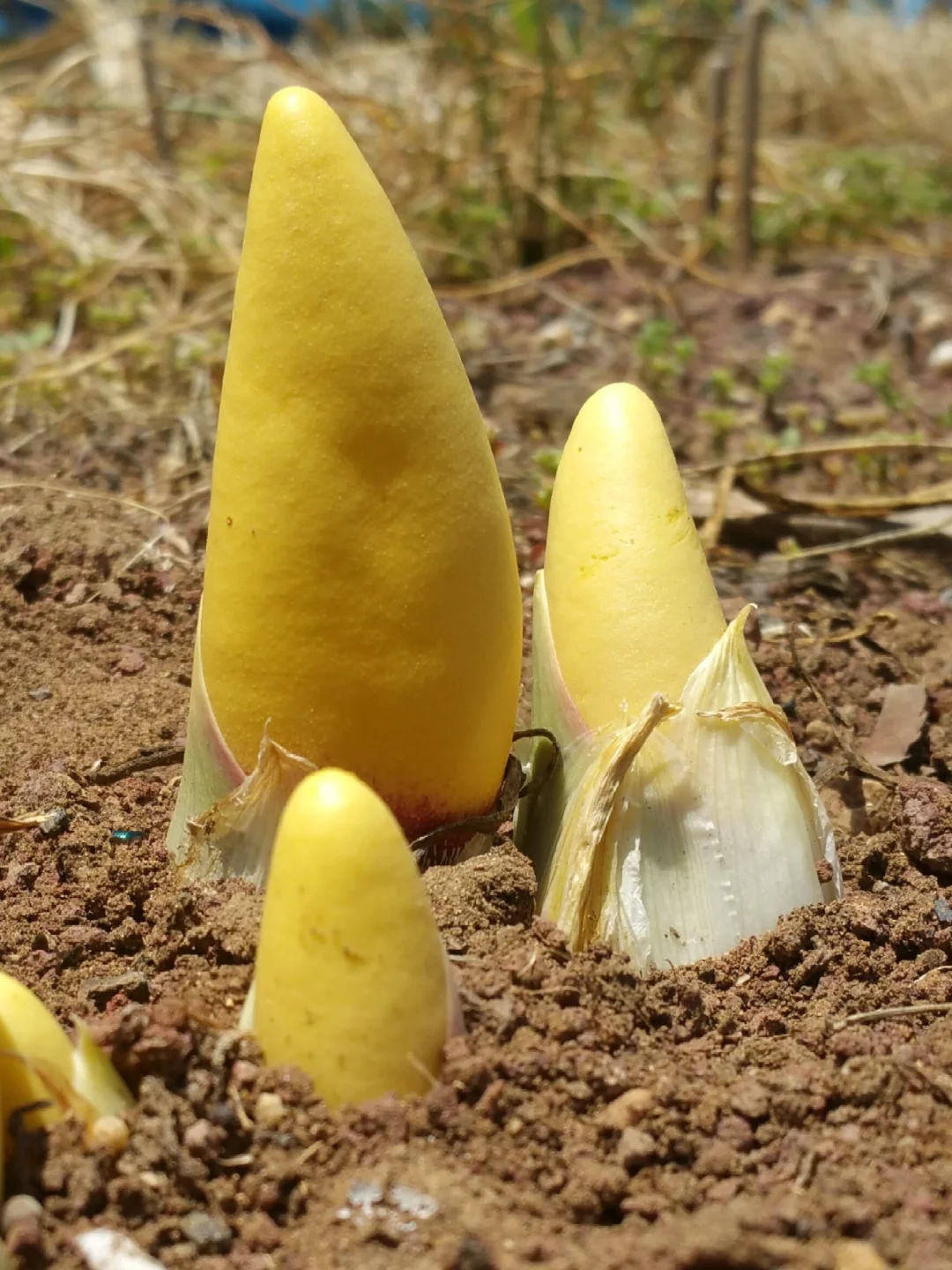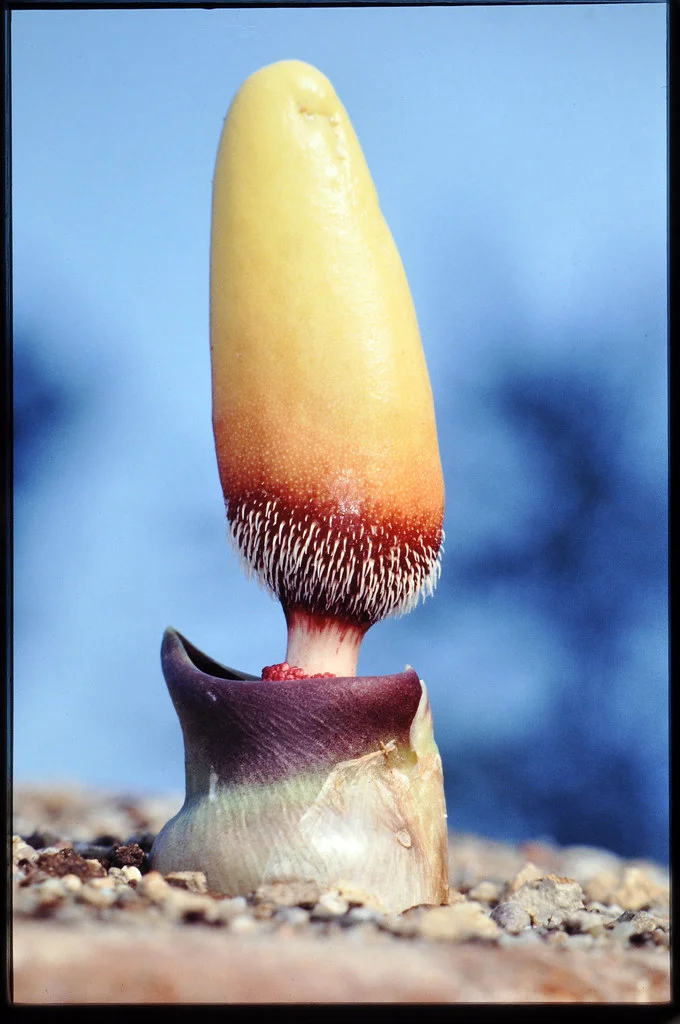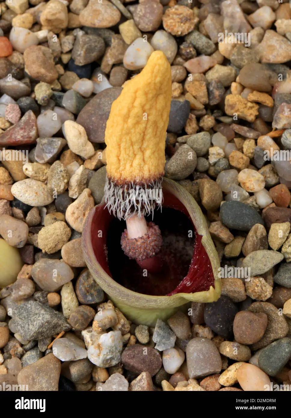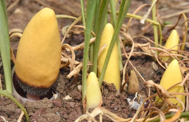 稀有球根Biarum ditschianum 这是一个仅在1989年被描述的物种。天南星科,破土芋属。 紫红色的花苞是如此之短,以至于它们被缩小到只是一个边缘,或者略高于地面水平面,有一个巨大的,非常肥大的金色花苞从中心伸出。花穗的基部清楚而明显地被朝下的白毛覆盖。除了惊人的和有趣的花序,这个菌株的叶子也是非常装饰性的,是一个很好的蓝绿色的阴影,叶片明显地浮雕着花边图案。