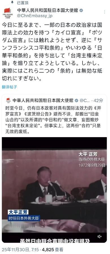 中国驻日本大使馆11月30日用中日双语写道:“时至今日,仍有日本政客对具有国际法效力的《开罗宣言》《波茨坦公告》避而不谈,却搬出‘旧金山合约’以及所谓的‘中日和约’做文章,妄图煽炒“台湾主权未定论”。但事实上,这两份‘合约’只是无效的废纸。” 声明里说得明明白白,至今还有日本政客对有国际法效力的《开罗宣言》《波茨坦公告》躲躲闪闪,反倒拎着“旧金山合约”和所谓“中日和约”瞎折腾,想炒作“台湾主权未定论”。   这算盘打得也太精了,可惜根本站不住脚,明眼人都清楚,这两份所谓的“合约”,压根就是没效力的废纸,拿废纸当依据,简直是滑天下之大稽。   先说说《开罗宣言》和《波茨坦公告》,这可是二战后确立国际秩序的重要文件,法律效力早被国际社会公认,里面清清楚楚界定了相关领土归属,容不得半点歪曲。   日本作为二战战败国,本就该老老实实遵守这些国际文件,可有些政客偏要选择性失明,对明确的规定避而不谈,无非是想打歪主意,心思太不单纯。   再看那所谓的“旧金山合约”,1951年美国纠集部分国家签订这份文件时,直接把中国、苏联等重要当事国排除在外,本身就是非法又无效的操作。   2025年8月18日,外交部发言人毛宁就明确说过,这份合约违反国际法基本原则,任何涉及中国领土主权的处置都是无效的,根本没资格被拿来当说辞。   当年中国政府就严正声明,不承认这份没经过自己参与制定的合约,国际上也有不少国家反对,这样一份先天不足的文件,日本政客还当个宝,实在可笑。   至于所谓的“中日和约”,本身就不符合国际共识,更违背了后来1972年《中日联合声明》里的重要约定,拿这种站不住脚的东西做文章,纯粹是自欺欺人。   1972年的《中日联合声明》里,日本政府明明已经充分理解和尊重台湾是中国领土的一部分,现在却有人翻出旧账瞎搅和,分明是想背弃之前的承诺。     日本部分政客这么做,说白了就是别有用心,想借台湾问题搅局,破坏地区稳定,可这种卑劣行径,只会让更多人看清他们的真实面目,根本达不到目的。   国际法讲究的是公平公正,是尊重当事国的主权和意愿,那份排斥重要当事国的“旧金山合约”,从诞生那天起就没站在正义的一边,自然没人认可。   那些日本政客以为拎着废纸就能混淆视听,怕是太高估自己的本事了,现在的国际社会不是当年,谁对谁错,大家心里都有一杆明明白白的秤。   台湾的主权归属从来就没有任何争议,《开罗宣言》里早就明确相关领土归还中国,后续的国际文件也一再确认,这些铁证摆在那,想抵赖都没门。   日本部分政客故意回避有法律效力的文件,反倒抱着无效合约不放,这种自欺欺人的操作,就像拿着过期的假证明想办事,纯属白费力气,还惹人笑话。   作为二战战败国,日本本该深刻反思历史,遵守国际规则,可有些政客偏偏反其道而行,总想在领土问题上搞小动作,迟早会为自己的行为付出代价。   国际社会之所以认可《开罗宣言》和《波茨坦公告》,是因为它们维护了战后国际秩序的公平正义,而那些单方面炮制的非法合约,终究只会被扔进历史的垃圾堆。   日本要是真想着和周边国家好好相处,就该让那些别有用心的政客收敛点,别再拿无效合约瞎炒作,别再打不该打的主意,踏踏实实遵守国际规则才是正道。   有些日本政客怕是忘了,违背历史潮流、挑战国际共识的人,从来都不会有好结果,拿着废纸当筹码,最后只会砸了自己的脚,落个贻笑大方的下场。   台湾问题是中国的内政,轮不到外人指手画脚,更容不得日本政客拿所谓的合约来煽风点火,任何干涉中国内政的行为,都会遭到坚决反对。   那些抱着侥幸心理想炒作“台湾主权未定论”的人,该醒醒了,历史事实和国际法准则摆在那,不是随便几句谬论就能歪曲的,再折腾也是徒劳。   尊重历史、遵守国际法,是每个国家都该有的底线,日本部分政客连这个基本底线都守不住,还想搞小动作,只会让自己的国际形象越来越差。   《中日联合声明》里的承诺是日本政府亲口做出的,言而有信是立国之本,要是连自己说过的话都不算数,以后谁还愿意真心和日本打交道。   和平稳定的地区环境,需要大家共同维护,日本部分政客的卑劣行径,只会破坏彼此之间的互信,给地区稳定添乱,这对谁都没好处。   历史的真相不会因为有人回避就消失,国际法的效力不会因为有人无视就失效,那些日本政客的荒唐举动,终究只会成为历史上的笑柄,警醒后人别再重蹈覆辙。   尊重彼此的主权和领土完整,遵守国际规则和历史共识,才是国与国之间相处的正道,只有走在正道上,才能收获真正的和平与发展,这是永远不会变的道理。
