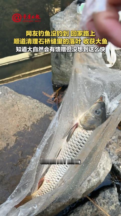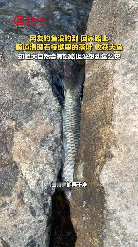 “这就是命啊!”11月26日,云南,一女子在河边钓鱼,结果一天都没钓到,最终失落的回家,经过河上的石桥时,女子看到落叶堵满了石缝,水流不过去了,她就弯下腰来一点点的清理,没想到落叶下面,还卡了一条大鲤鱼!网友:有德之人必有所得! 现在很多人都喜欢钓鱼,在河边一呆就是一整天,不过钓鱼很讲究运气,技术再好,也可能一条都钓不到,还有一些人只是单纯的享受这个过程,钓完鱼后会把鱼再放生掉。 当天中午,女子走在河边时,看到有人在捞河虾,这瞬间就激起了她钓鱼的兴趣,于是立即准备好装备,在河边悠闲地钓了起来。 可惜事与愿违,女子钓了一整天都没有收获,看到桶里空落落的,女子只能失望的收拾走人。 就在她穿越石桥时,却发现上游的落叶,将不少石缝堵的严严实实,水已经漫到桥上了,担心别人走上来的时候滑倒,女子便蹲下来清理落叶。 等到落叶清理得差不多后,女子竟看到石头缝里还有一条鲤鱼,她顺手就给抓了上来,没想到“好人有好报”来得这么快! 网友看后表示,万物皆有因果,女子的善良举动埋下了因,这才收获了这条大鱼,仿佛一切都是冥冥之中安排好的,大家也要多做好事。 信息来源:《网友钓鱼没钓到 回家路上顺道清理石桥缝里的落叶收获大鱼 知道大自然会有馈赠但没想到这么快》新重庆-重庆日报