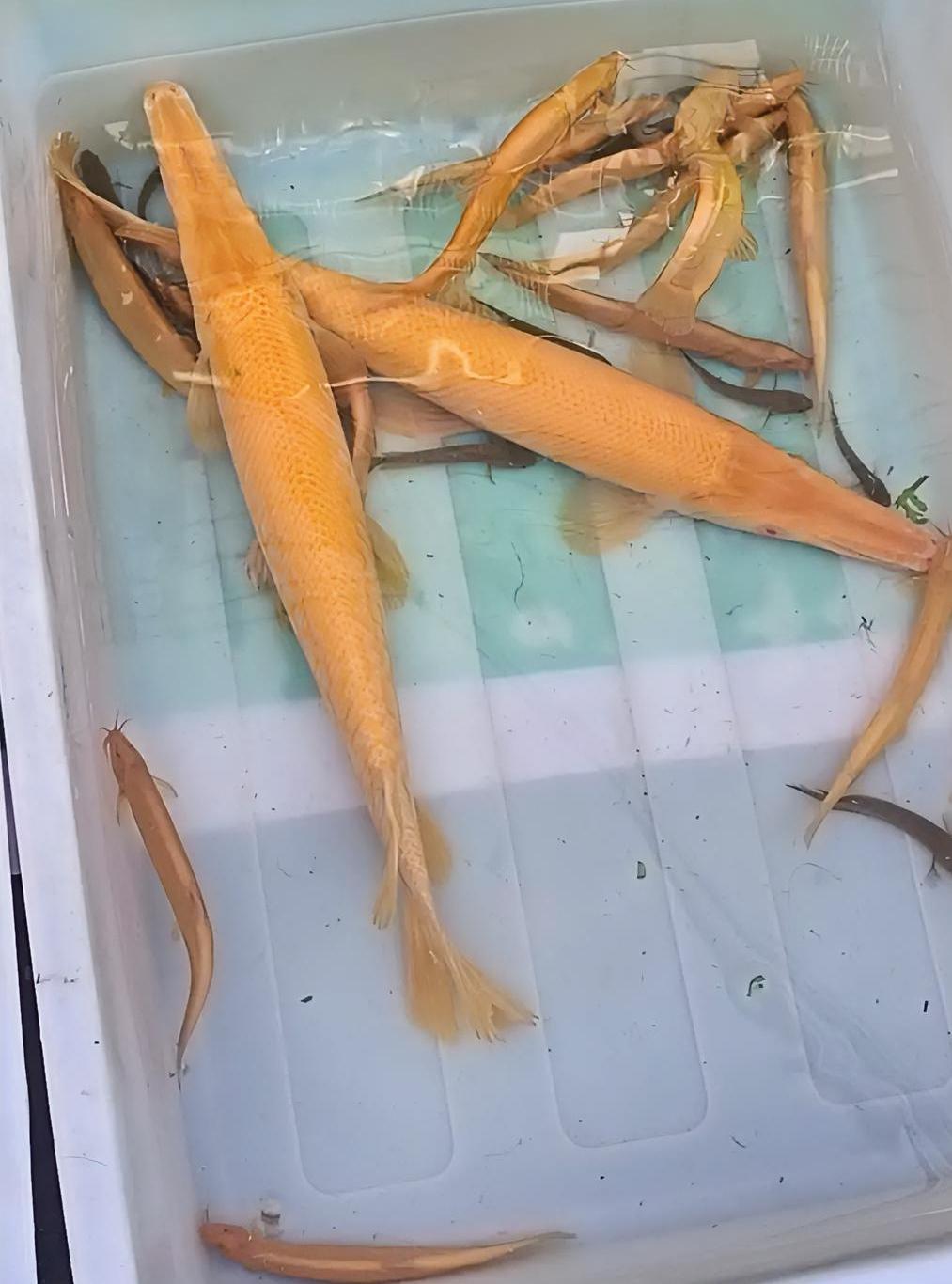 在市场上偶遇这金灿灿的鱼,第一眼还以为是啥稀罕玩意儿呢!这细长的身子、尖尖的嘴,通体金黄跟镀了层金似的,看着怪特别的~ 问了摊主才知道是金眼䱻(huá)鱼,也有人叫它金泥鳅、黄金火箭,还是第一次见这么漂亮的鱼,活脱脱像水里游的“金条”! 就是不知道这鱼吃起来啥味儿,有没有吃过的朋友来聊聊?这颜值这么高的鱼,下嘴是不是都得犹豫一下?😜黄金魷鱼 黄金泥鳅 黄金泥鳅鱼 金光鱼