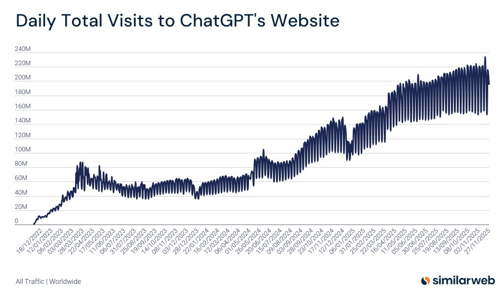 ChatGPT 官网按访问量算排名全球第 5,中国排名第 1 的 AI 官网是 DeepSeek,全球第 92。