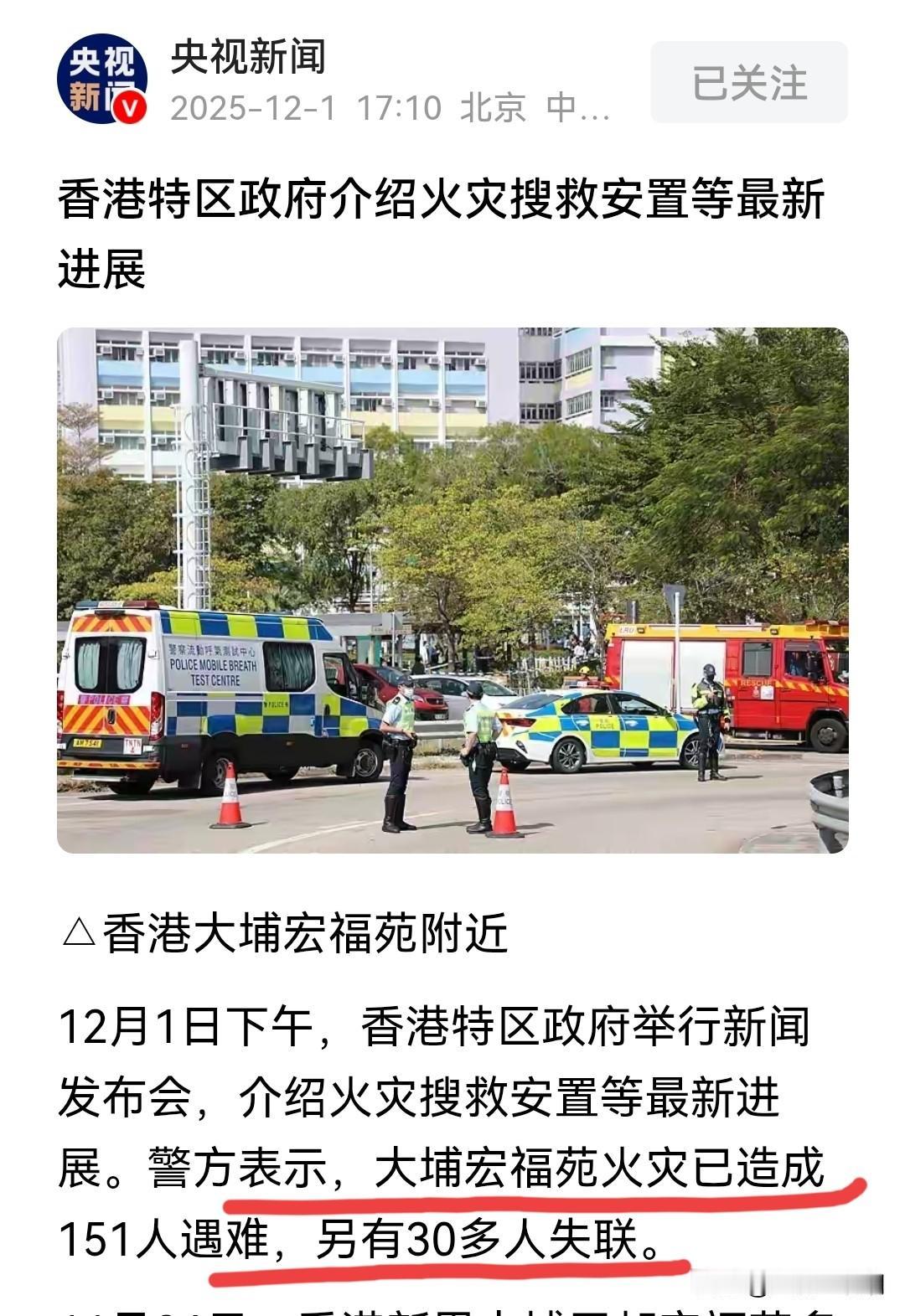 香港警方: 宏福苑火灾已造成151人遇难,还有30多人失联… 安全生产,不是喊口号,不是表面文章,而是必须时时刻刻都要落实到位,落实到每一个细节之中,一场火灾造成如此大的伤亡,教训太惨痛了,愿逝世安息!🙏🙏🙏