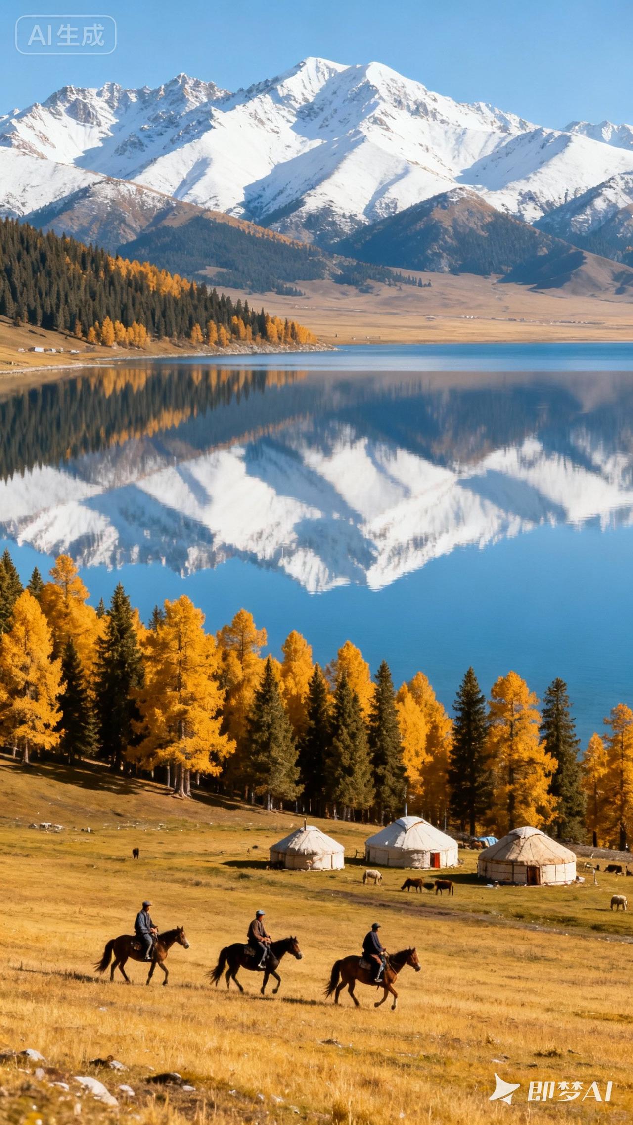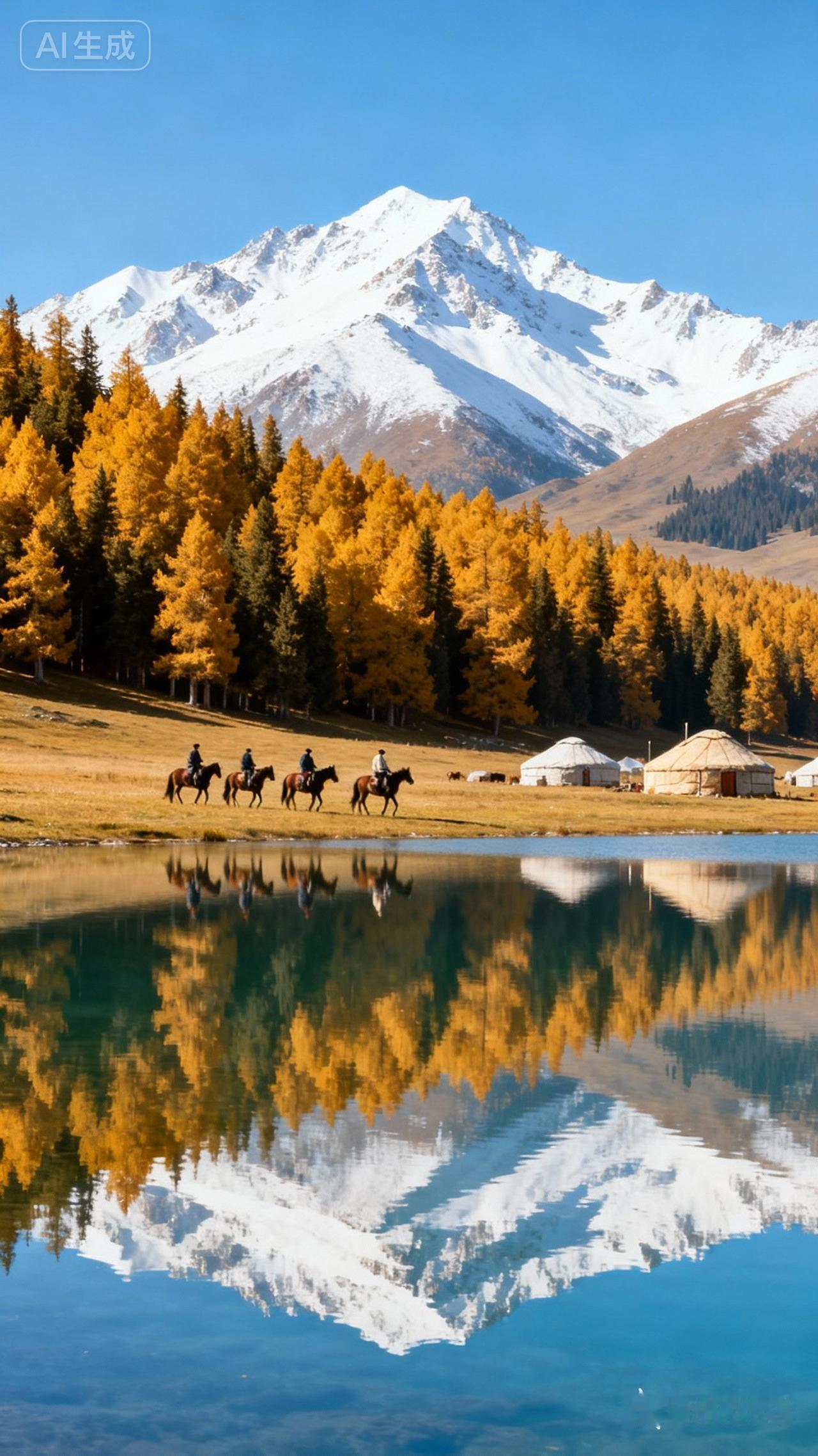 赛里木湖的秋韵 当秋风掠过“大西洋最后一滴眼泪”,赛里木湖便晕开了独属于北疆的诗意。 岸边的云杉林先接了秋的信笺,针叶层叠着染成金箔色,像被阳光揉碎的琥珀,簌簌落满湖岸的草甸。远处的雪山仍披着终年不化的白,冷冽的峰尖却被秋阳镀上暖光,与湖畔的金黄林莽撞出冷暖交织的画框。 毡房的炊烟缠着风飘向湖面,四骑人影踏过泛黄的草地,马蹄轻叩着秋光,连带着毡房的轮廓,一起落进湖水的镜里。赛里木湖的蓝是浸了寒的,却把雪山的白、林木的金、行人的影都妥帖接住,风过时,倒影揉成细碎的光,又在波纹里重新拼出天地的模样——这是赛湖的秋,一半是雪山的清寂,一半是秋林的炽热,连风都在这里慢成了湖水的褶皱。
