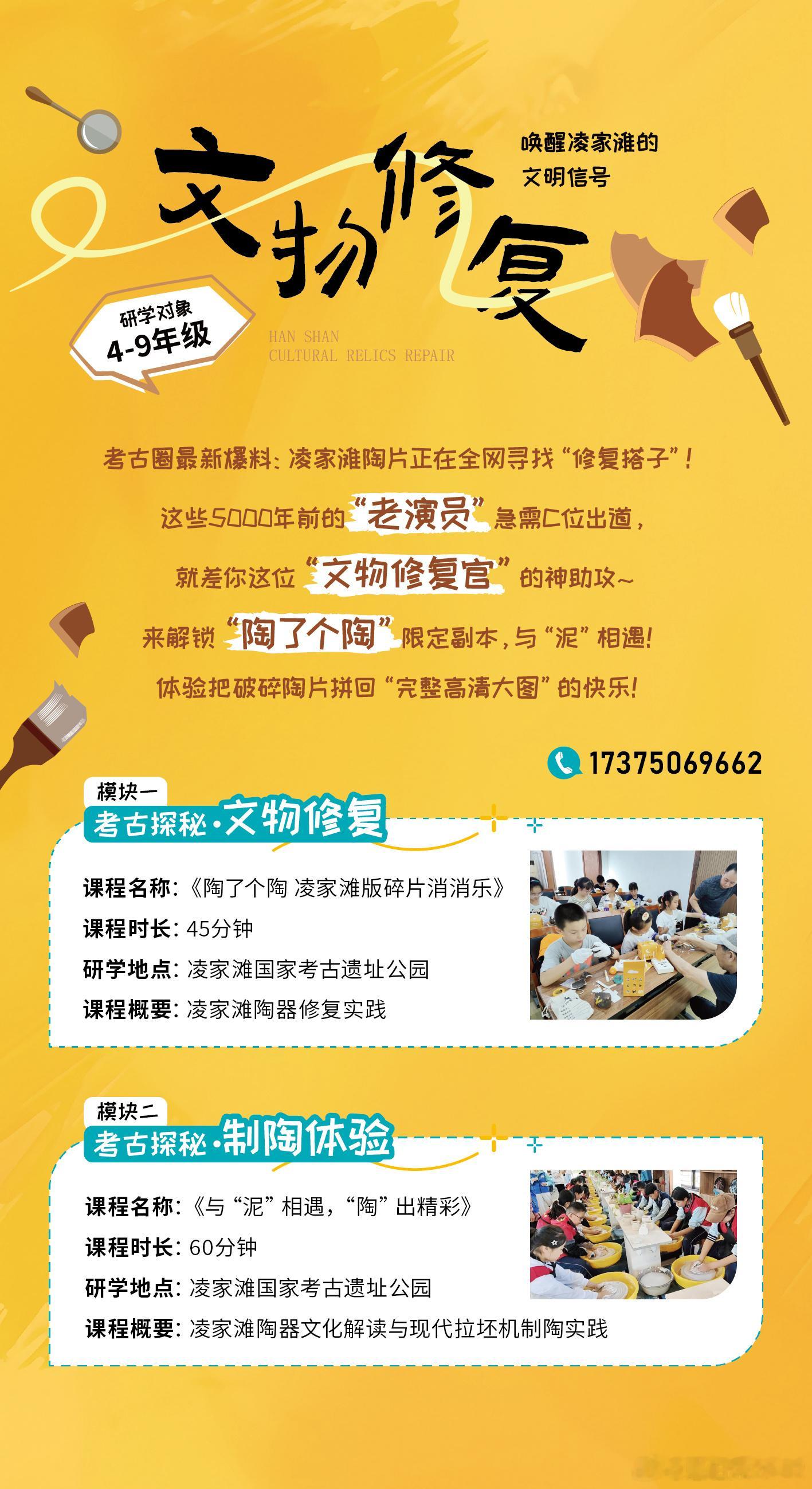 来凌家滩体验“文物修复”!对话5000年前文明你没听错~孩子可以在凌家滩体验“文物修复”全过程了!研学旅游,就来含山!一起走进凌家滩国家考古遗址公园让“一日考古家”不再是梦想~你可以:✔参观考古发掘现场、文物修复工作站、分析“出土文物”✔可以走进“古法工坊”,在老师指导下,体验拉坯塑形✔还可以学习天文知识,制作和使用测时工具激发指尖创造力,对话古老文明……含山研学旅游,不止“文物修复”褒禅山人文实践、华阳洞地质探险、太湖山生态体验……多线并行,任你挑选!告别“打卡式”旅行我们要的是深度体验、亲手触摸、真实感悟~冬天不宅家,来含山,与文物面对面!四季含山 研途不凡冬游含山go年货含山文旅研学含山陶器修复研学旅行寒假去哪玩凌家滩凌家滩国家考古遗址公园文物修复官