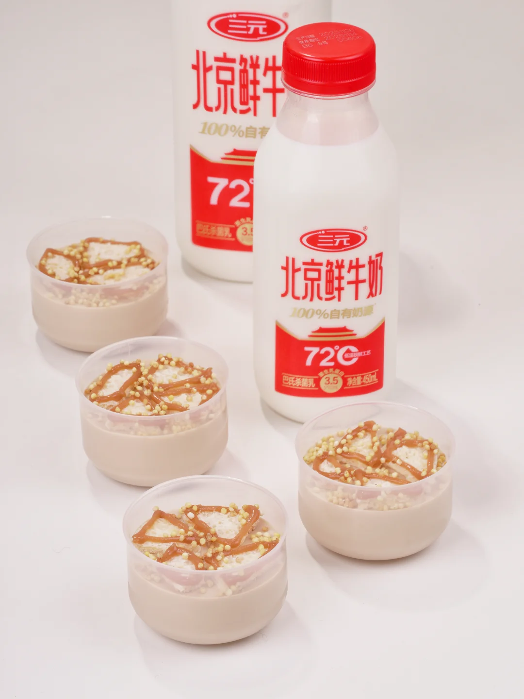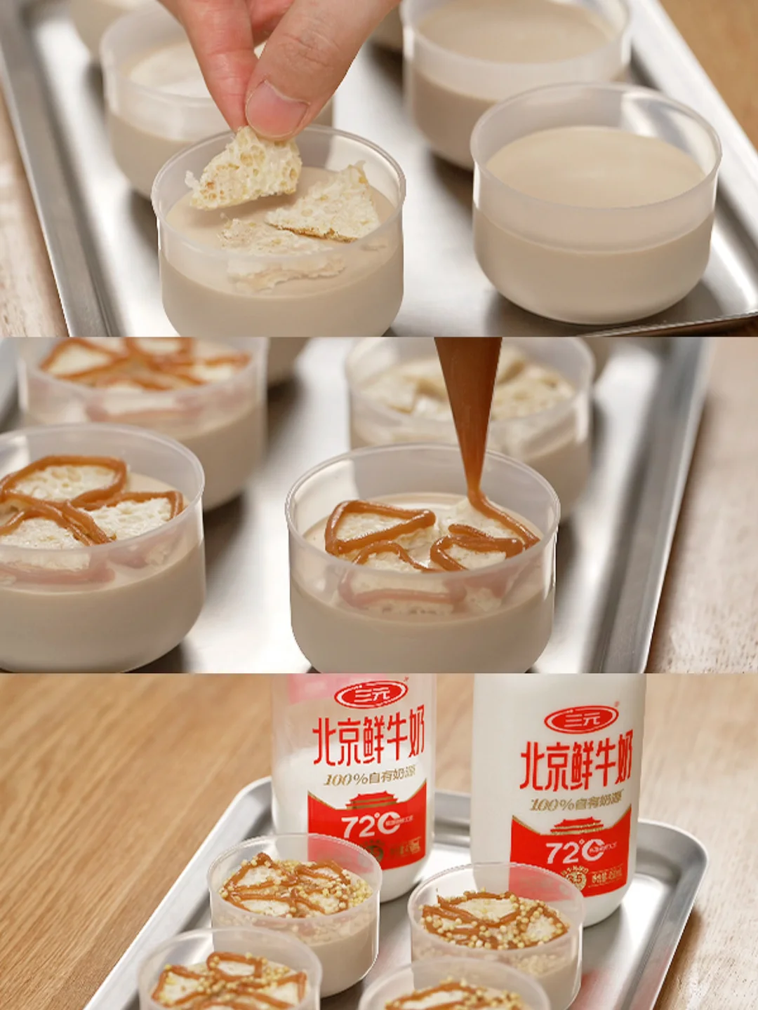 这个咸奶茶鲜奶冻,奶香浓郁,入口咸香,微甜,搭配上脆脆的炒米和浓香的奶皮子,真的是一绝。牛奶我用的是三元北京鲜牛奶,100%自有奶源,每百毫升含有3.5克原生乳蛋白,奶香味纯正。最近都在用它做甜品,客户试吃了我们的鲜奶冻都夸好吃。