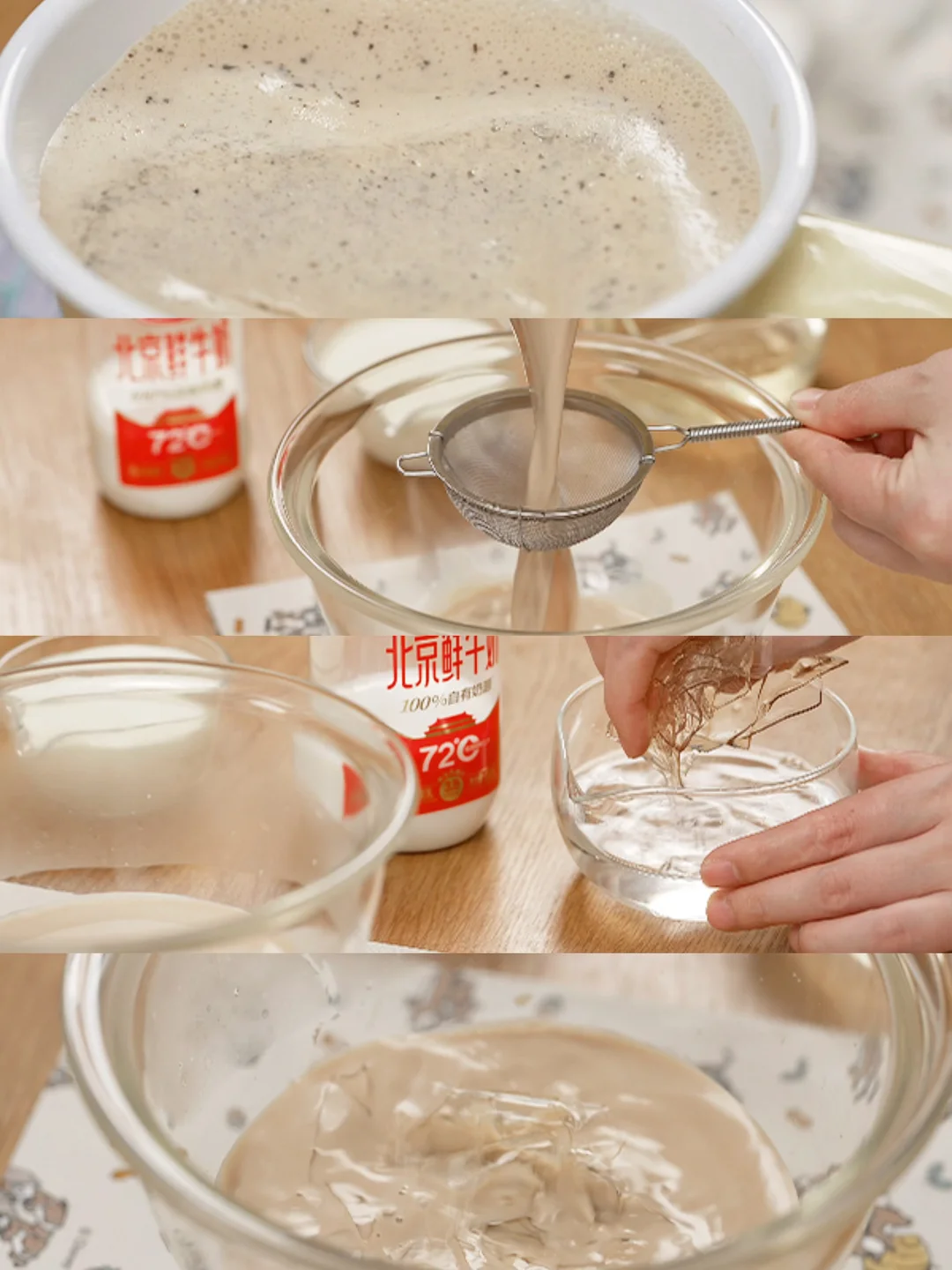 吉利丁片提前用冰水泡软,过筛掉茶渣后加入。