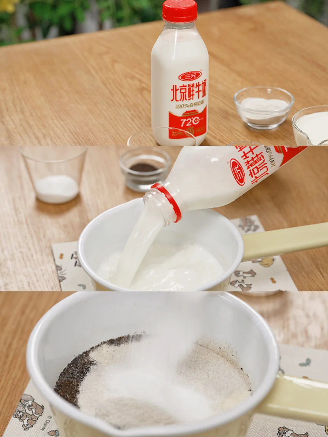 三元北京鲜牛奶和红茶咸奶茶粉一起加热至沸腾,盖盖焖出茶香味。