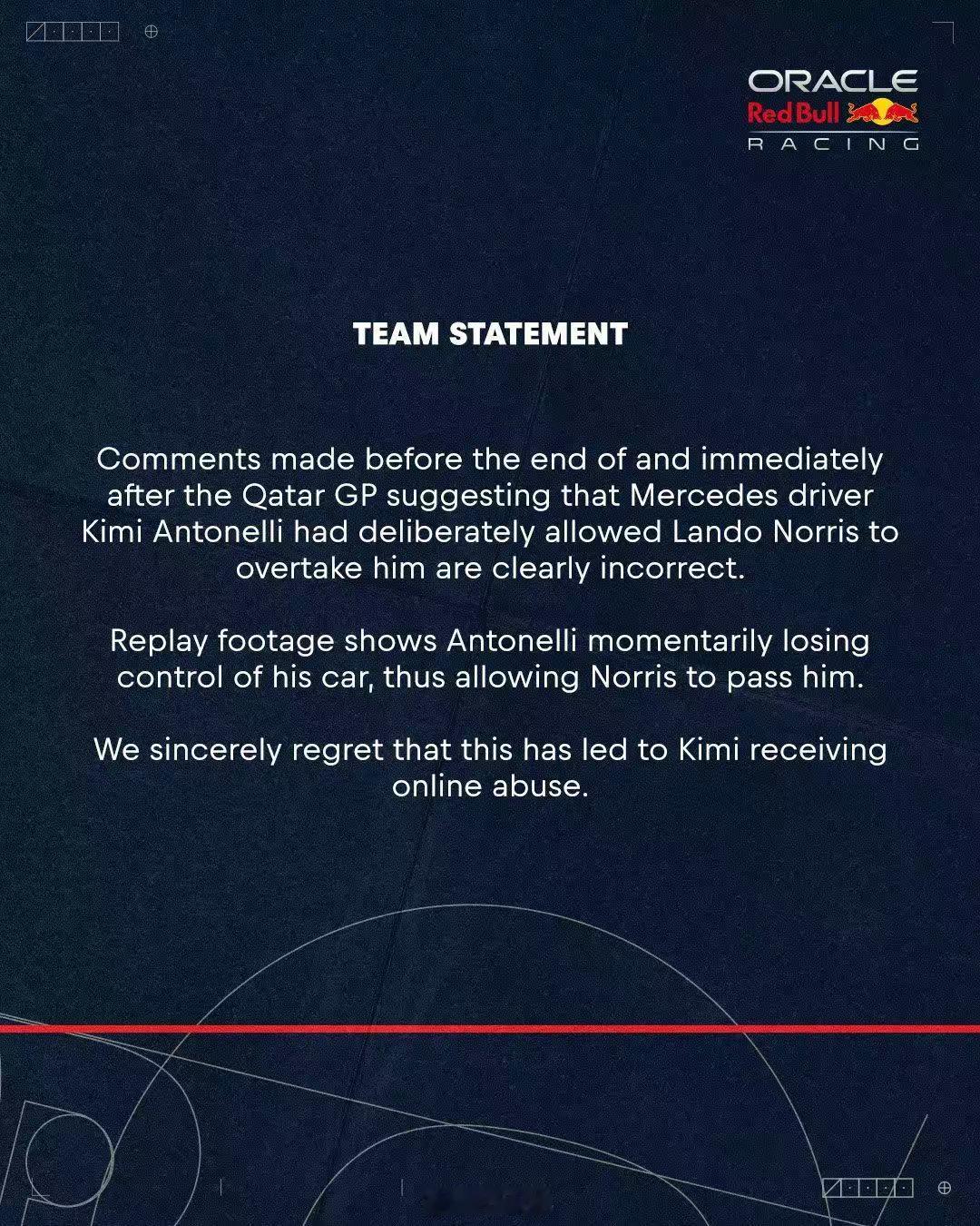 红牛车队赛后因GP对小kimi故意放车诺里斯的言论道歉F12025f1卡塔尔大奖赛