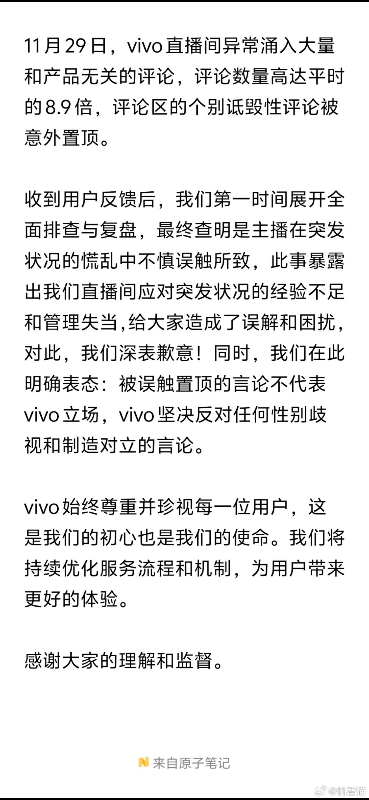 vivo公开回应了直播间评论争议:置顶的争议评论是主播在突发状况下不慎误触所致